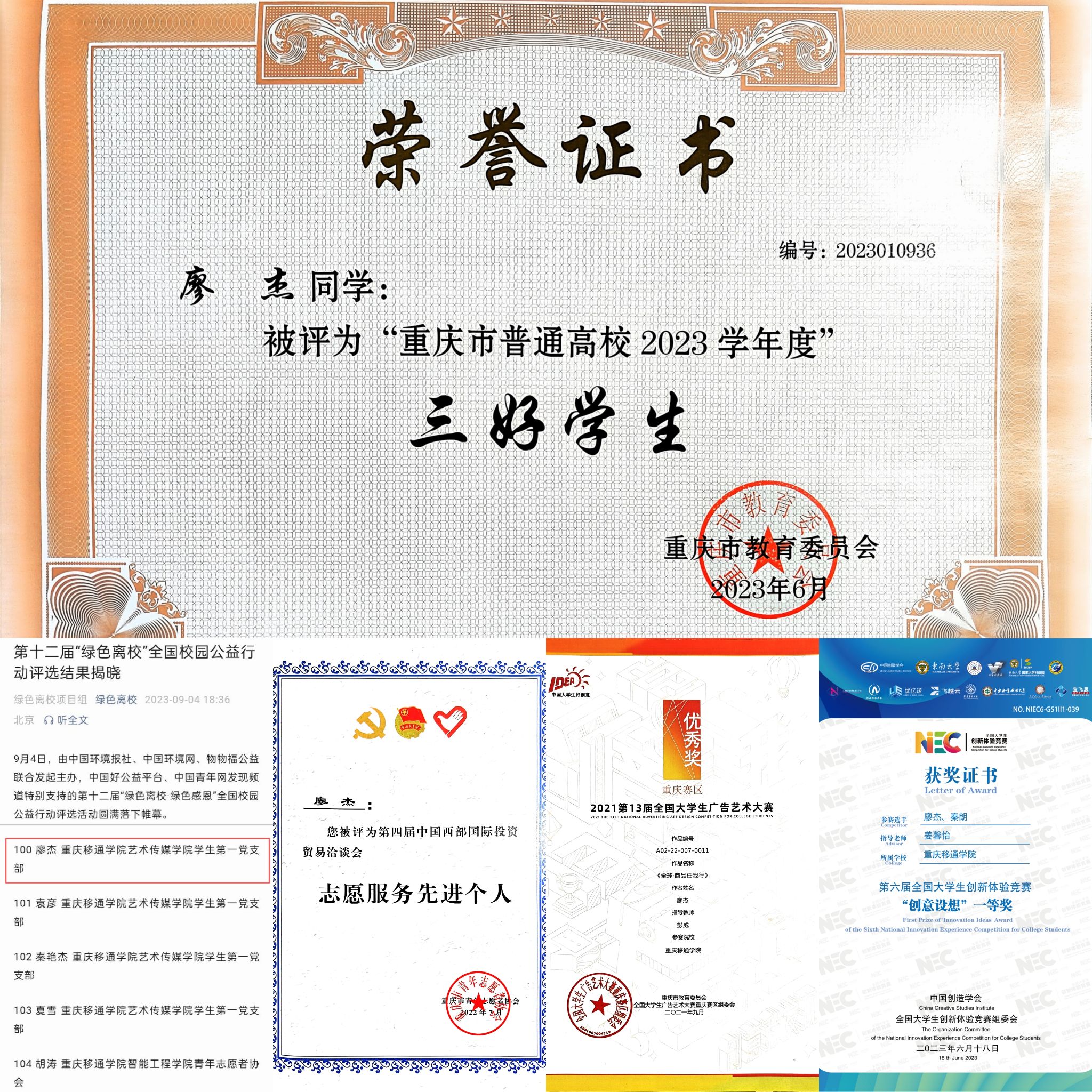 重庆市“青马工程·红岩菁英学校”大学生骨干培训班第十六期学员。曾实习于合川共青团。曾任校学生社团管理中心主席团成员、团中央青年发展部“创青春”新媒体工作室成员、重庆移通学院模拟政协协会负责人、第十三期“青马工程”完满教育学生骨干培训计划2班班主任、艺术传媒学院班导师、艺术传媒学院第二届党建工作站宣传部部长、2020级数字媒体艺术2班班长。在校期间荣获市级“优秀毕业生”、“三好学生”、“‘返家乡’优秀个人”,校级“优秀共产党员”、“移通之星-工作标兵”、“完满达人-工作达人”、“优秀共青团干部”、“优秀学生会干部”、“移通优秀学生奖学金”等40余项奖项及荣誉。