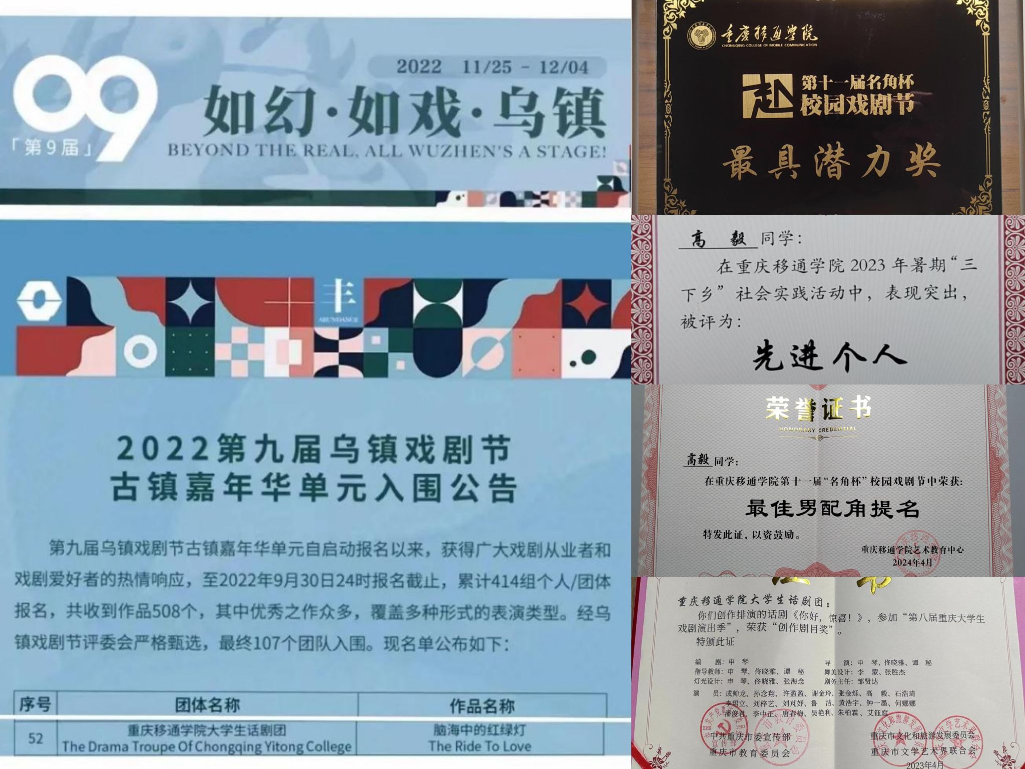 高毅,别都书院2021级大数据与计算机科学学院学生,曾任大学生话剧团内务部干事、校“秘密”合唱团行政部干事、大学生艺术团主持分团干事、班级心理委员、天使关艾志愿服务专项支队队员。在校期间荣获第九届乌镇国际戏剧节古镇嘉年华单元的《脑海中的红绿灯》入围、重庆首届爱乐之星青少年艺术展演《如愿》金奖、重庆市第七届大学生艺术展演活动艺术表演类戏剧集体项目一等奖、重庆市艺术教育活动先进个人、第八届重庆大学生戏剧演出季创作剧目奖、重庆市第七届大学生艺术展演活动声乐合唱专场二等奖、重庆市大家唱群众歌咏活动(第三片区)优美队伍称号,校级完满教育艺术星耀奖学金、第十一届名角杯校园戏剧节“最佳男配角”提名、“最具潜力奖”、“最受欢迎剧目奖”、第十四届合唱比赛优秀奖、校级“文艺活动先进个人”、“精神文明先进个人”等荣誉称号。