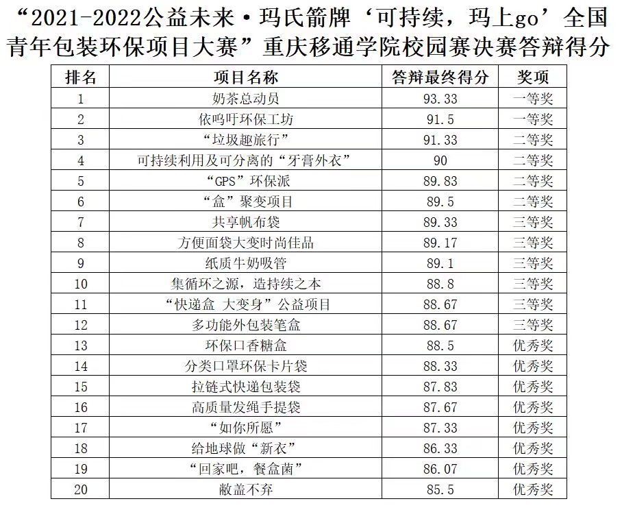 在本次比赛排名前三的队伍将代表我校参加2021-2022公益未来·玛氏箭牌“可持续,玛上go”全国青年包装环保项目大赛西南地区区域赛,相信优秀的队伍一定会拿出更饱满的态度,站在更高的舞台上,让移通为更多高校所知,移通学子将不负韶华,勇往直前!