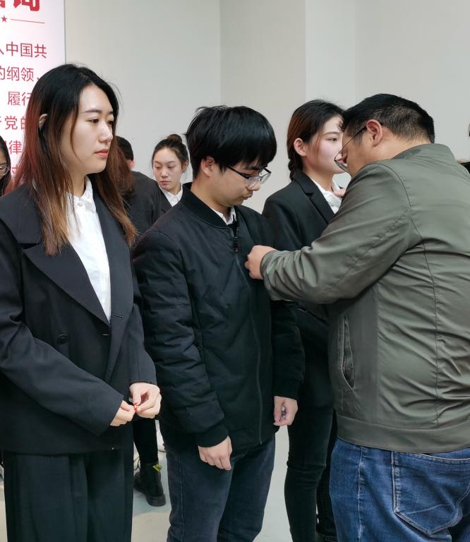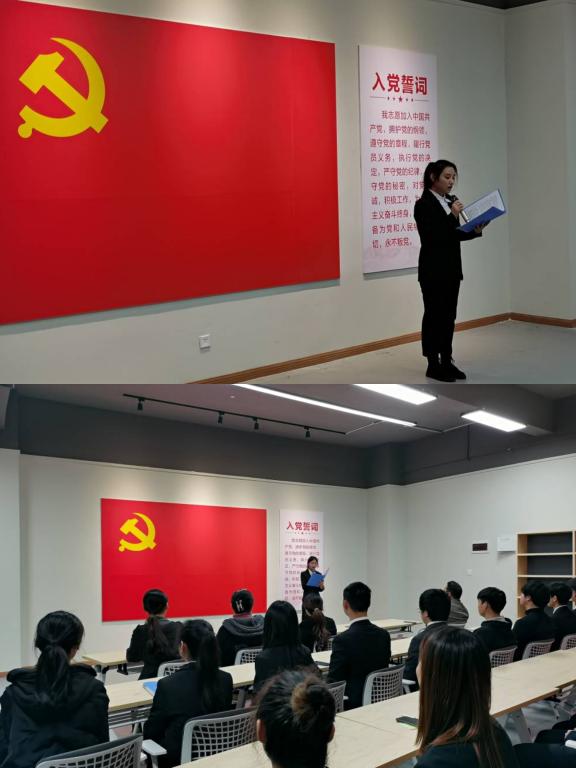 主持人莫晓雯老师宣读了党委的批复和参加宣誓的预备党员名单,对新加入党组织的预备党员表示欢迎。接下来校纪委书记、院总支书记尹浩亮同志和学生支部负责老师们为预备党员们佩戴了党徽。在尹浩亮同志的领誓下,全体新发展预备党员进行了入党宣誓,短短一百多字的誓词抒发对党忠诚的决心,面对着党旗,许下了他们入党后对党的第一个承诺。