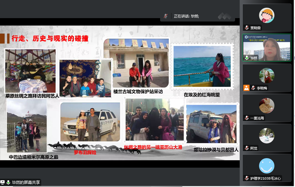 学生们在直播间用连续送花的方式表达对毕然老师的喜爱,有着作家及插画家多重身份的毕然教授的确带有些许异域风情,她接上主持人的介绍,轻松讲述早年对丝绸之路的研究旅行及创作,认为身体和灵魂必须有一个在路上,并身体力行的抵达了很多常人无法企及的地方:罗布汩、楼兰故城、帕米尔高原、亚洲之心、红海、撒哈拉沙漠、地中海沿岸、埃及金字塔、卢克索神庙……同时展现了在路上的收获:53部图书作品及获叶圣陶文学金奖、第五届政府出版奖等十几项业内奖项。