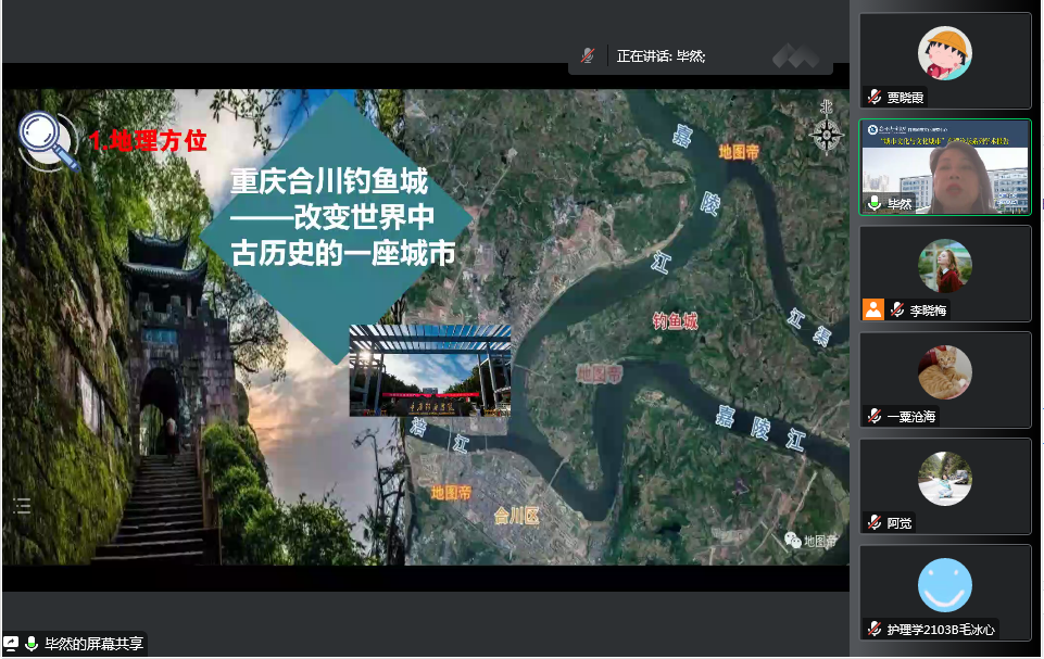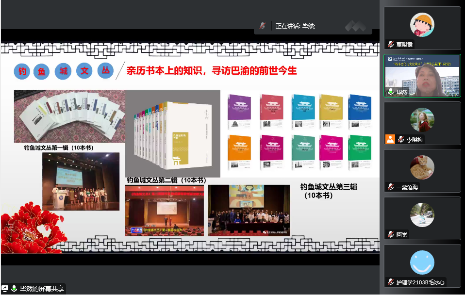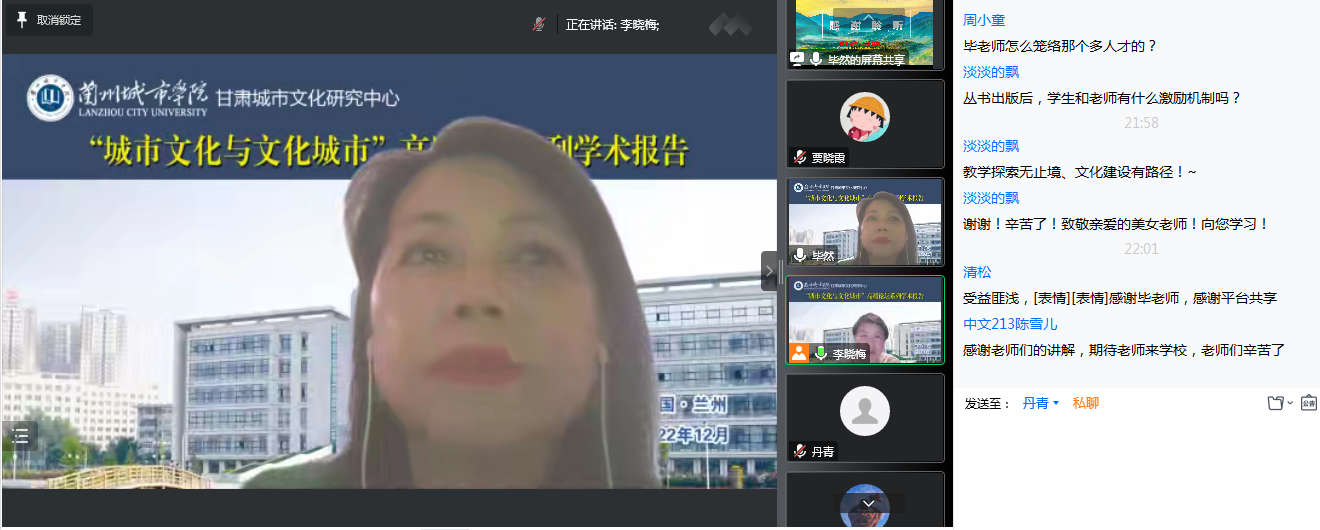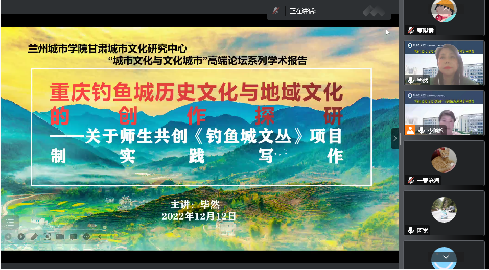 12月12日晚19:30,由兰州城市学院甘肃城市文化中心举办的“城市文化与文化城市”高端论坛系列学术报告第四场在腾讯会议展开,我校创意写作学院毕然教授受邀参加并进行《重庆钓鱼城历史文化与地域文化的探研——关于师生共创“钓鱼城文丛”项目制实践写作》专题讲座。