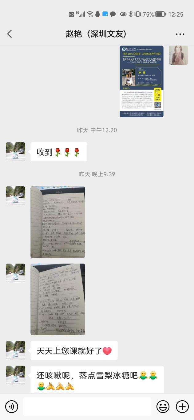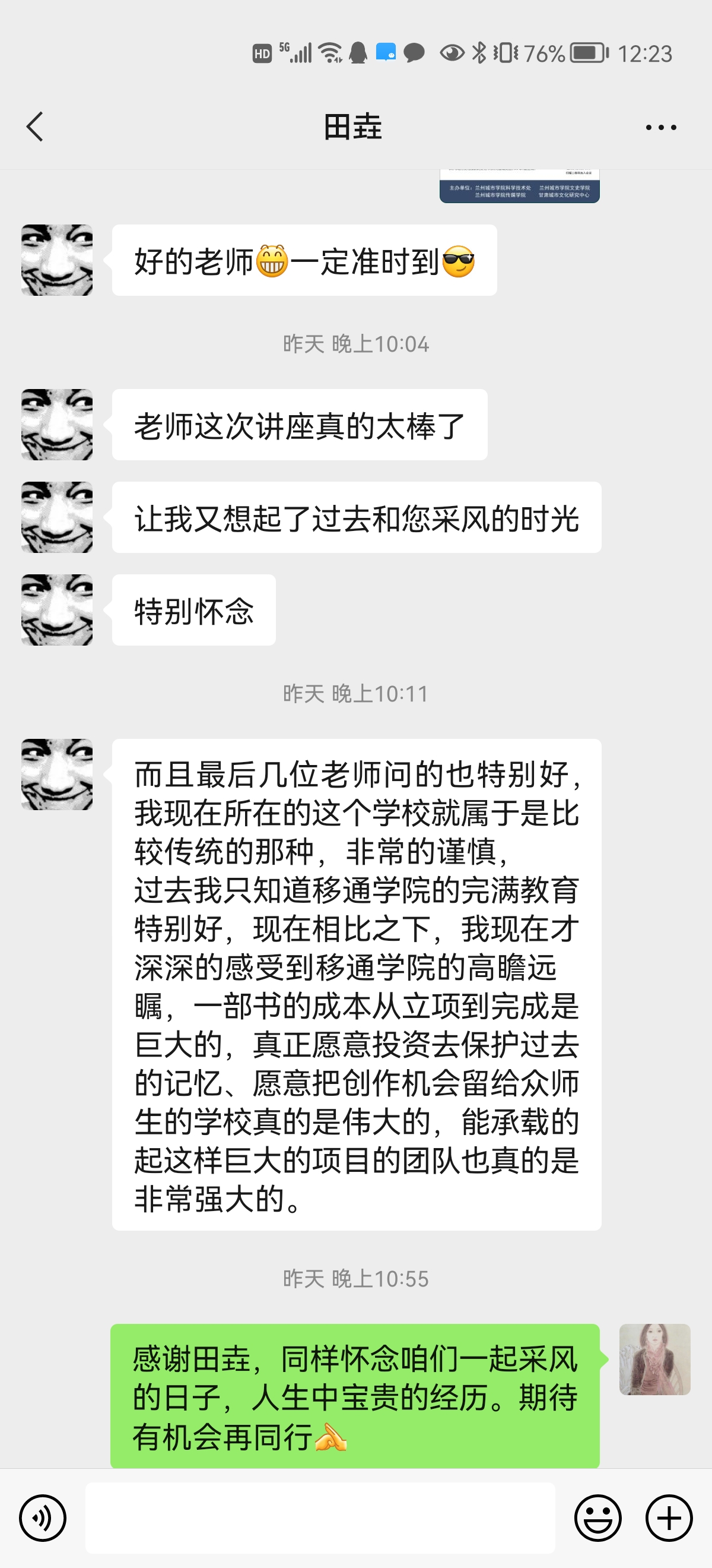 毕然老师的学生田垚是重庆移通学院首届创意写作实验班的学生,曾经参与《钓鱼城文丛》第三辑项目制,他留言道:老师这次讲座真的太棒了,让我又想起了过去和您采风的时光,特别怀念。最后几位老师的问题也特别好,我现在所在的学校属于比较传统的那种,非常谨慎,不会让老师和学生大胆尝试。过去我只知道移通学院的完满教育特别好,现在相比之下,我现在才深深的感受到移通学院的高瞻远瞩,一部书的成本从立项到完成是巨大的,真正愿意投资去保护过去的记忆、愿意把创作机会留给众师生的学校真的是伟大的,能承载得起这样巨大的项目的团队也真的是非常强大的。