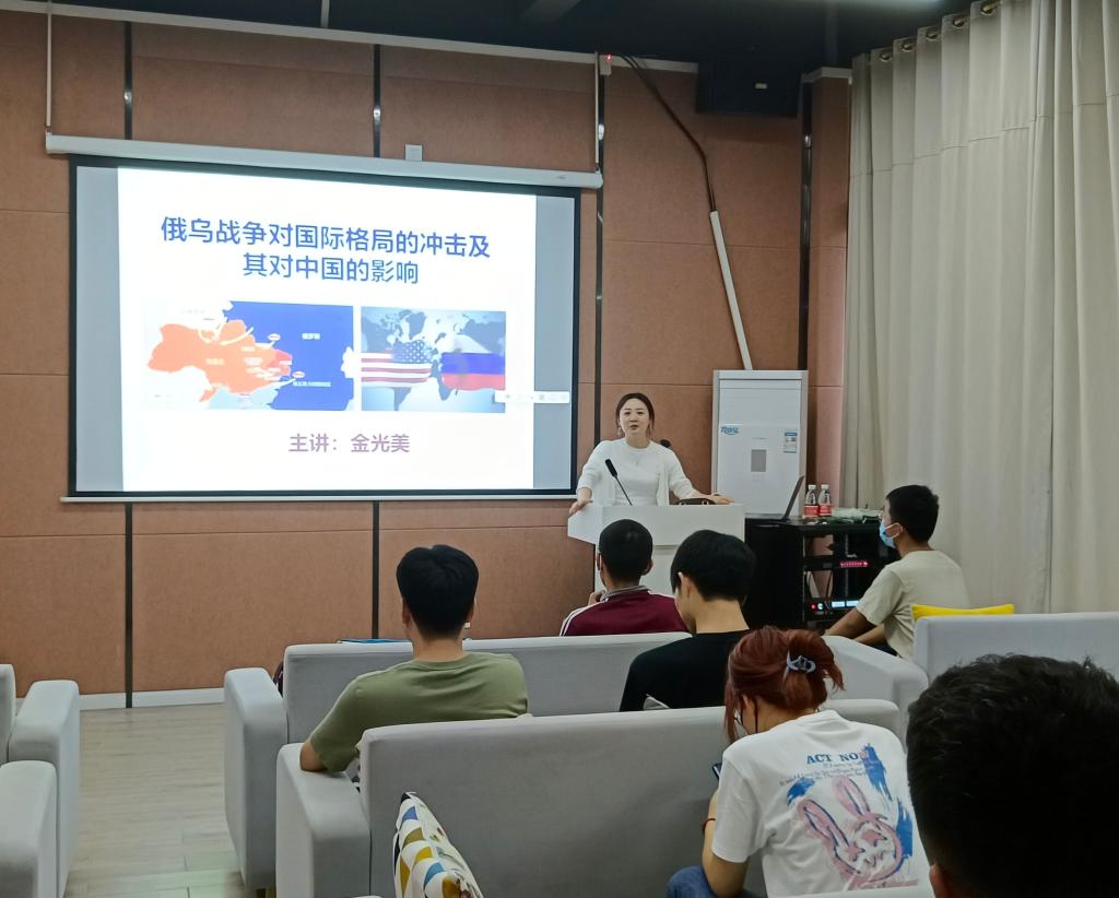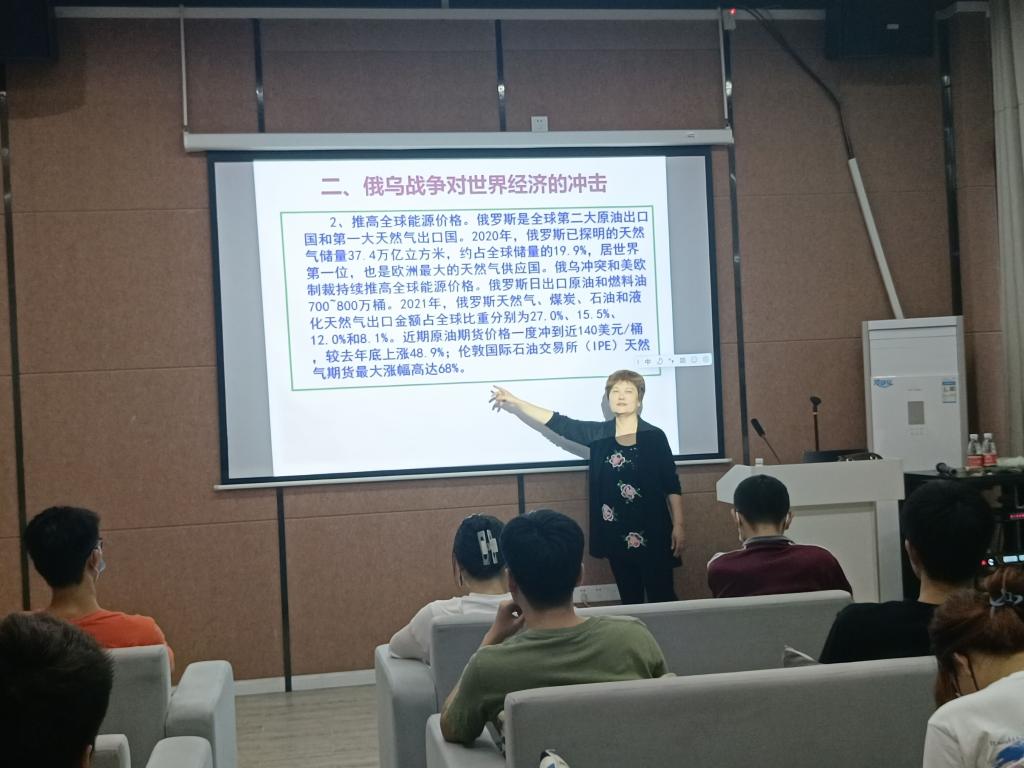 金老师接着说道:这场战争对中国的影响同样不容小觑,中国成为了各方争取的对象,国际影响力进一步提升。俄罗斯牵制了美国为首的西方国家的力量,中国面临的战略压力得以减轻,中国的战略机遇期得以延长;中国在全世界的政治经济份量和综合影响力将进一步提升,且会被越来越多的国家和人民视为维护和平、稳定世界、主持公道的主要力量。在可以预见的未来,至少在未来的几十年里,美国从根本上失去了联俄制华的可能性;由于美国为首的西方国家对俄罗斯的制裁和禁运,腾出的俄罗斯市场空间有利于中国开拓海外市场;随着俄罗斯东向战略的实施,中俄关系会更加紧密,合作规模与深度均会进一步加强。总之,世界经济的重心出现了自西向东的位移,加快了世界格局多极化的进程。金老师声情并茂的解读赢得了现场阵阵掌声。