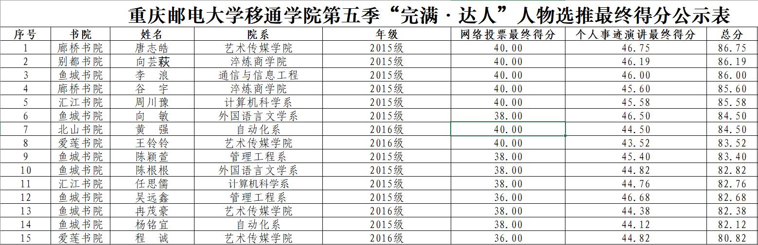 经过前期人物推荐、评审团初选,共选出15名“完满·达人”候选人进入网络投票和个人演讲环节。在演讲环节结束之后,工作人员在校学生会权益部的监督下,根据候选人得分情况,最终确认重庆邮电大学移通学院第五季“完满·达人”人物选推最终得分,并公示如下: