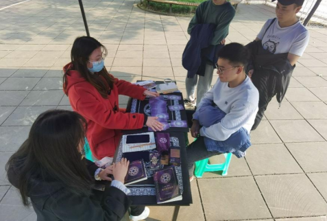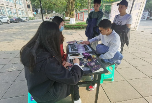 活动当日,工作人员早早来到黄桷树广场值班点进行现场的布置。社团内部工作人员分工明确,忙中有序地为同学们占卜。路过的同学们对塔罗牌充满了好奇,迫不及待地加入到占卜活动中。现场气氛活跃,塔罗牌社员向同学们普及塔罗牌知识:塔罗牌分为大阿尔卡那和小阿尔卡那两种牌型,分别对应不同需求的占卜。同学们兴致立刻提升起来,不断询问工作人员塔罗牌的相关介绍,在一片欢声笑语中与工作人员进行互动,体验占卜带来的乐趣和魅力。