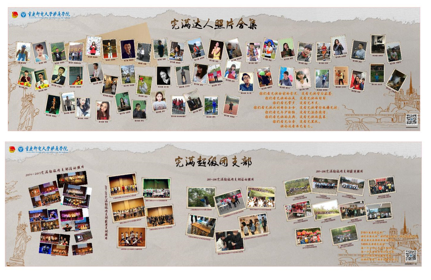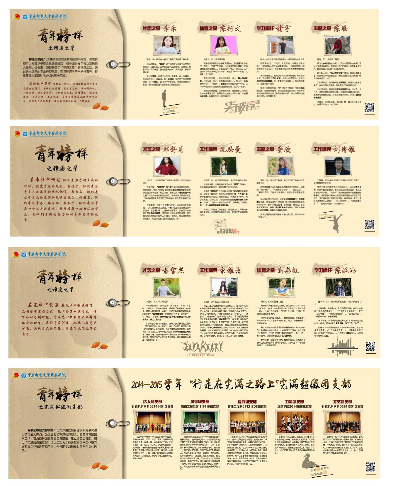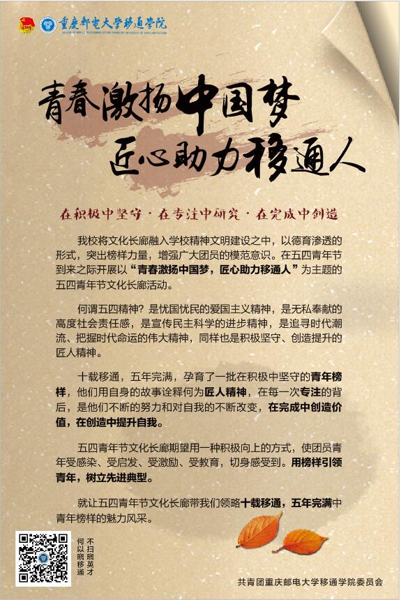 在五四青年节到来之际,团委直属部门举办了一系列“文化长廊”活动,来弘扬传统的“五四精神”。把近几年从全校选拔出的学生榜样“移通之星”“完满达人”“完满力量”的光辉荣耀和拼搏事迹进行展示,从而让更多的青年学生学习他们的责任意识、拼搏精神。同时展现他们在完满生活中的心路历程。