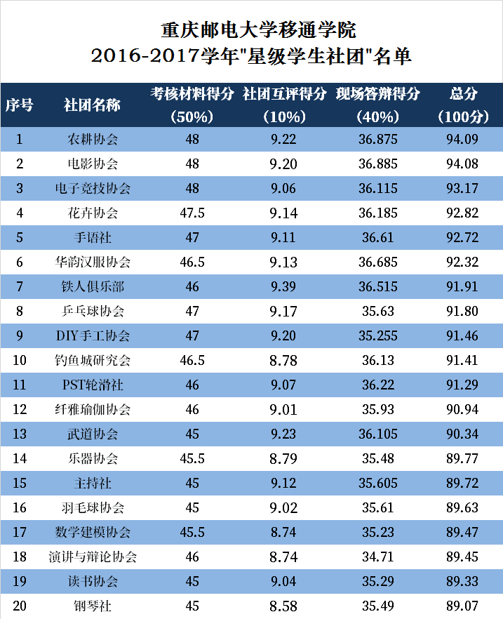 活跃的校园社团活动的开展,离不开各个社团的大力支持,而一批批优秀社团的出现就更为精彩的校园生活锦上添花。本次“星级学生社团”答辩活动参与团体分别来自体育竞技类、学术实践类、艺术拓展类的“优秀学生社团”共33个,通过50%考核材料得分、10%社团互评得分及40%答辩得分三个方面核算最终得分,排名前20的学生社团将荣获“星级学生社团”称号。