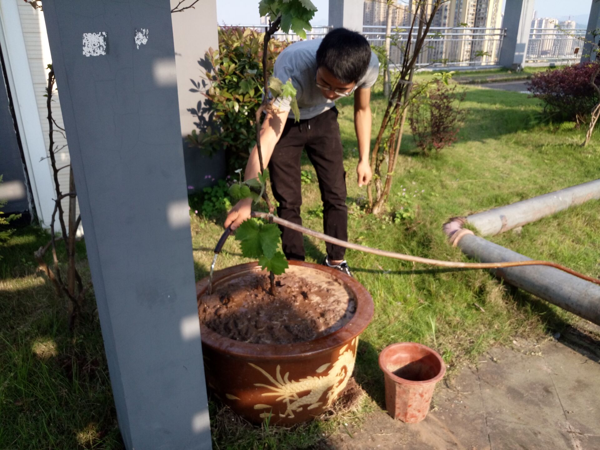 图书馆楼顶新增20盆葡萄,考虑到楼顶土壤比较薄,不利于葡萄的生长,特意申购了20个特大号的龙缸。新种植的葡萄已经长出了两串小小的葡萄,期待葡萄丰收的日子,在葡萄架下偷听牛郎织女讲话。