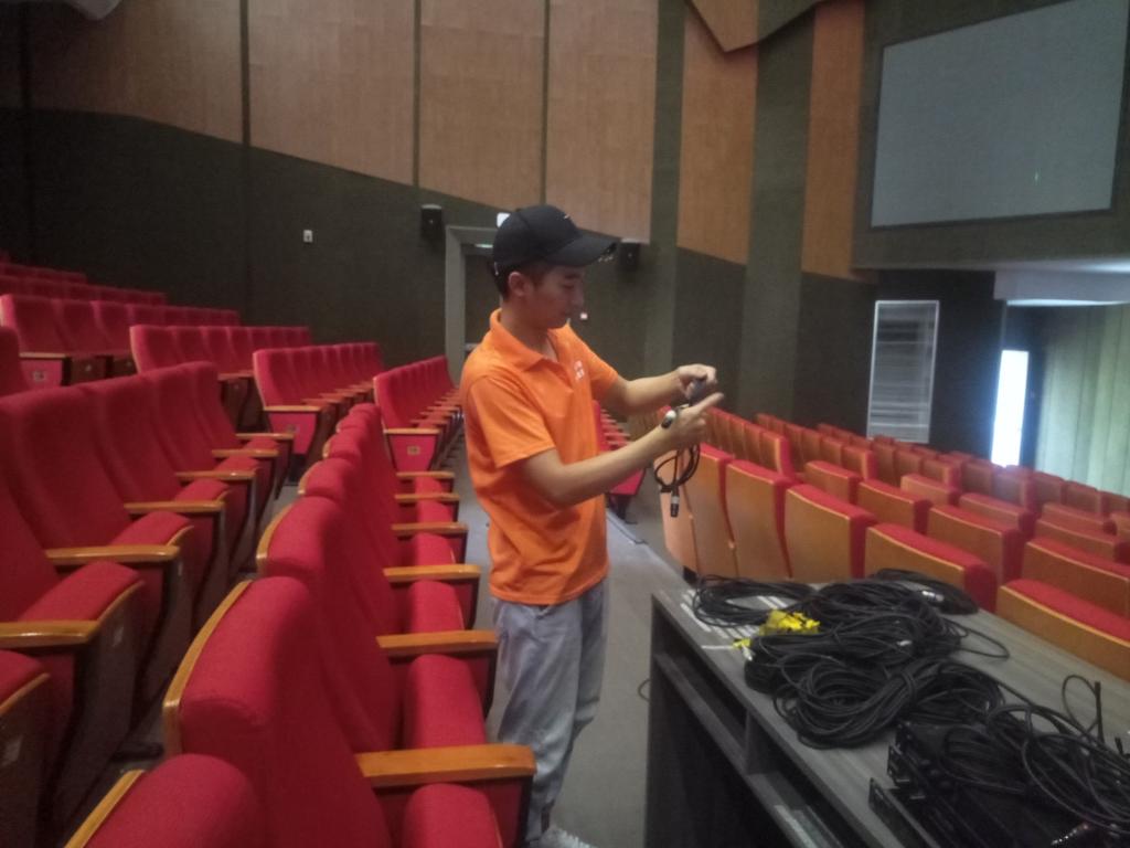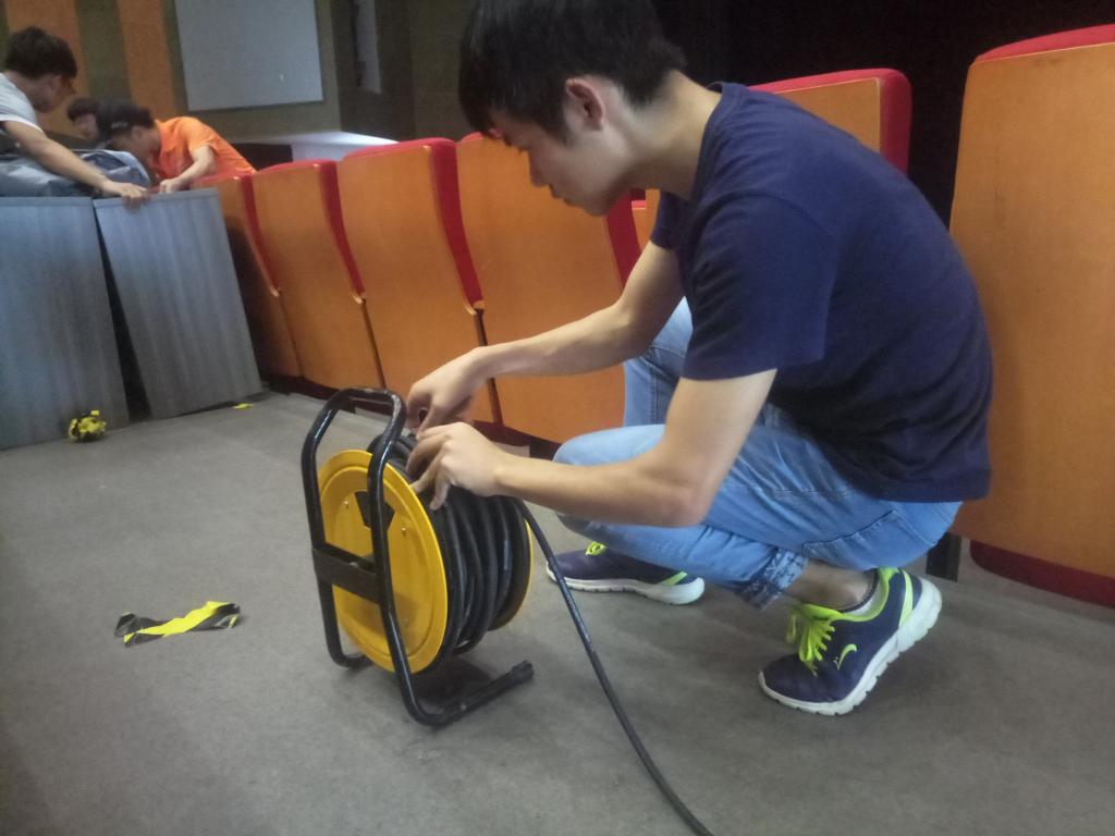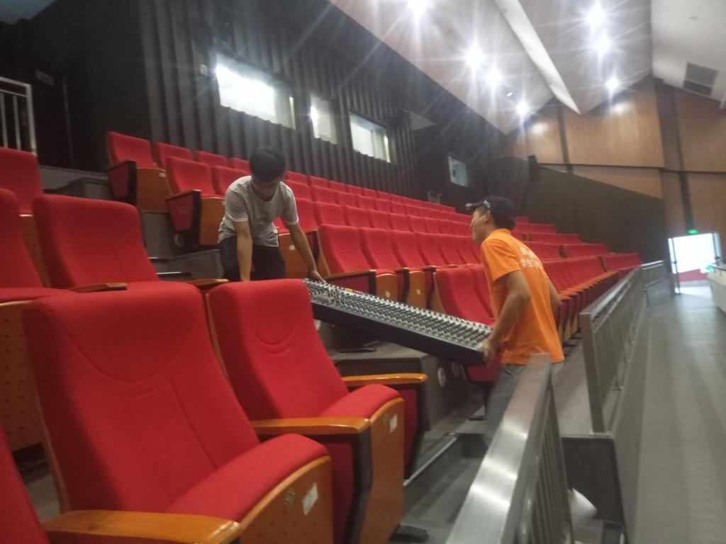 七月的天气就像热恋的情侣,温度越高,激情越满。都说夏天是拿来休眠的,可是剧场管理团队的成员们却精神倍增,即使是最后的检查收尾工作,他们也丝毫不懈怠。在转移调音台的时候,他们相互合作,互相提醒着注意安全,“轻一点,别磕着了”,“慢慢来,别绊倒了”,虽是简简单单的几句话,但细枝末节处体现的都是满满的关怀。搬桌子时,男生主动选择重的一端照顾起女生,与其说是绅士风度不如说是彼此熟悉后的相互照顾的深厚情谊。收线时,他们仔细的用塑料袋栓在插线头上以防潮,小小的举动展露了他们长期工作下来的专业素养和对设备的呵护。也有成员带伤坚持来到剧场,虽不能出力,但及时送上的一句“辛苦了”早已浸透同伴们劳累的心。从刚开始见面的娇羞腼腆,到越发浓重的团队默契与配合。他们之间相互鼓励和彼此照顾的感情,正如炎炎夏日的温度不断上升,也恰如这碧蓝的天空,干净、纯洁。再一次站上舞台,看看剧场,平时热闹非凡的缤果大剧院,这一刻,它,安静了。