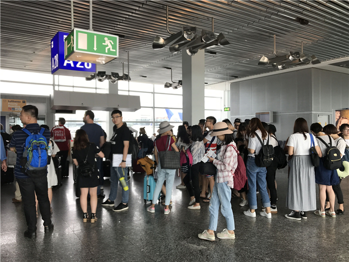 下午从重庆出发,晚上便到达了北京,北京的天气也是炎热无比,虽不能与重庆相提并论,但给我的感受却也是汗流浃背。到达北京之后,我很快与我们的小伙伴们进行了汇合,在北京休息一晚之后。第二天凌晨,我们坐上了飞机,前往了下一个目的地——法兰克福。从北京飞往法兰克福,需要十个小时的时间,飞机上的生活是无聊的,但有着其他小伙伴的陪伴,这看似很长的十个小时的路程也匆匆而过。2017年7月11日,比利时时间6点,我和我的小伙伴们到达了法兰克福,刚下飞机,随之袭来的是一股冷意,我们一行人的穿着都比较单薄,习惯了祖国的炎炎夏日,却不习惯异国他乡的凉风阵阵。也是在此刻,我突然清楚的意识到,我已经身处远离祖国的异国他乡。由于天气较凉且还要赶往下一个目的地,我们并没有做过多的停留,简单休息后便拖着疲惫的身体坐上赶往布鲁塞尔的飞机。