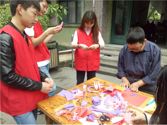“奶奶,我们一起来折纸吧!”志愿者们热情地邀请爷爷奶奶加入折纸活动。被志愿者们热闹的氛围感染的奶奶用一双巧手,一把剪刀和几张纸片,就折出了五彩斑斓的精彩人生。一张纸的表现语言并不是简单的平铺直叙,而是托物寄语。种种质朴的怪诞的而又包含率真至美的折纸,寄托着志愿者们对老人们的殷切牵挂与祝福。