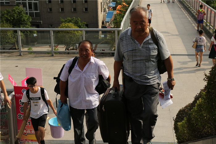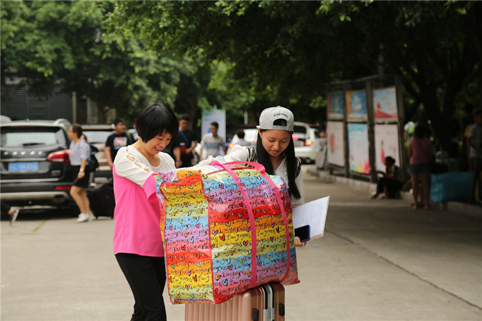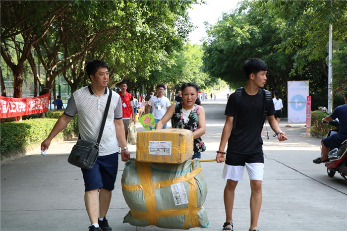 随处可见扛着大包拖着小包,满头大汗却满脸笑容的家长,他们知道,大学是孩子新的开始,虽然行李繁重,但是家长们也笑着完成送孩子进大学的第一步。