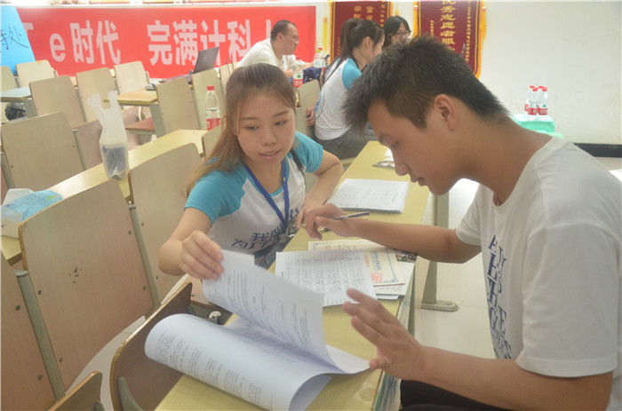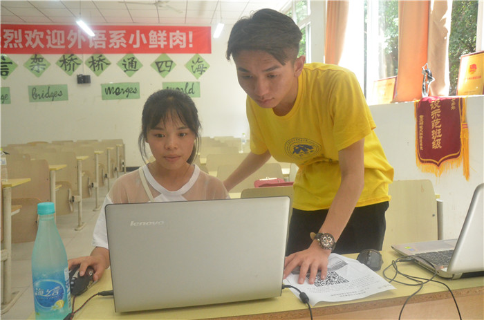 天气酷热难当,去图书馆缴费的学生和家长在焦急地等待。如果说迎新季有专属颜色,那么它一定是红色。门口的志愿者们要从早上8:00一直站到16:00,负责维持现场的秩序,来自通信工程系就读于通信与信息专业的刘江也是其中一员。问他为什么想当志愿者,他这样回答:“老实说,有两个原因,第一个是当志愿者可以加学分,第二个是关于我自身的经历。去年我作为新生的时候,从火车站到学校,都有学长们帮我提东西,他们帮助了我,今年我作为学长,我也想体验一下这种感受。虽然天气很热,但是在他们有问题时,帮助他们解答问题还是很开心的。而且他们都很热情,一直在道谢。”志愿是什么?也许就是觉得这样做对得起帮助过自己的人,把这份热情转化为生命中最美的底色吧!