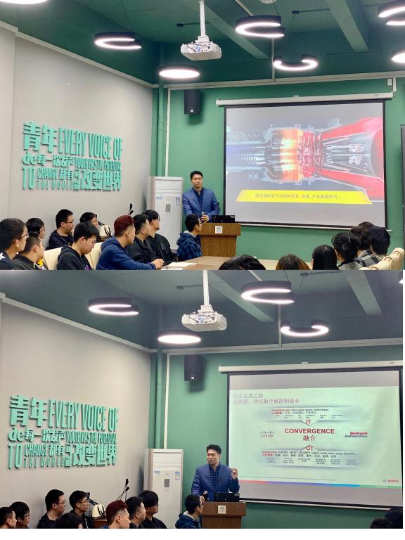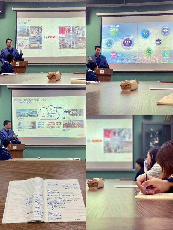 讲座伊始,王经理以一段幽默风趣的博世自治短视频开启了当晚别开生面的讲座。作为一名“世界博世人”,王经理以图文并茂的方式向全体师生介绍了博世集团的发展史、业务市场、以物联网为例的博世集团战略核心等方面,在场的每位师生都沉浸在这个世界百强企业的丰富而独特的企业文化盛宴。