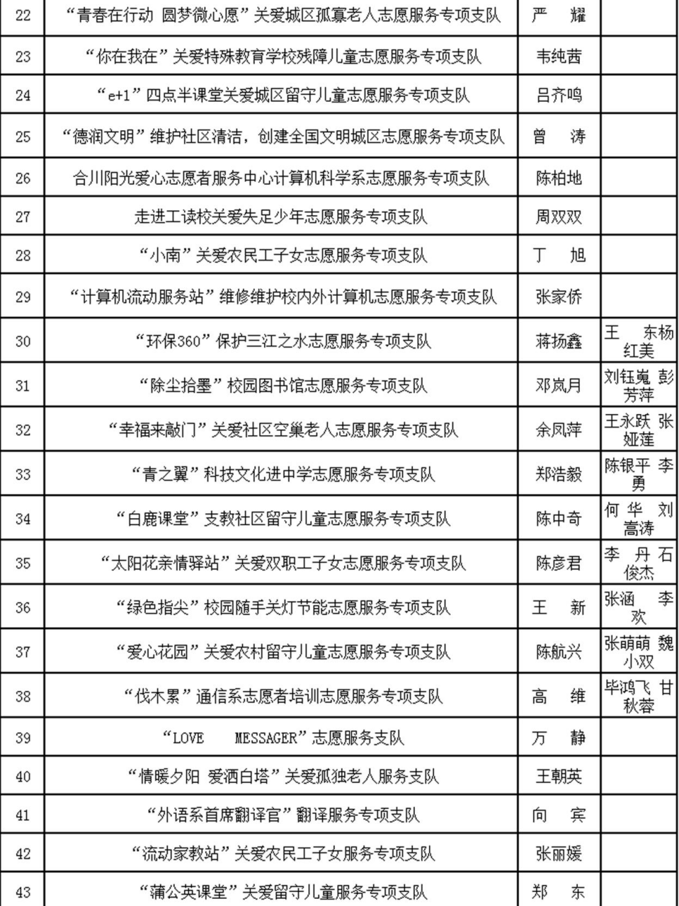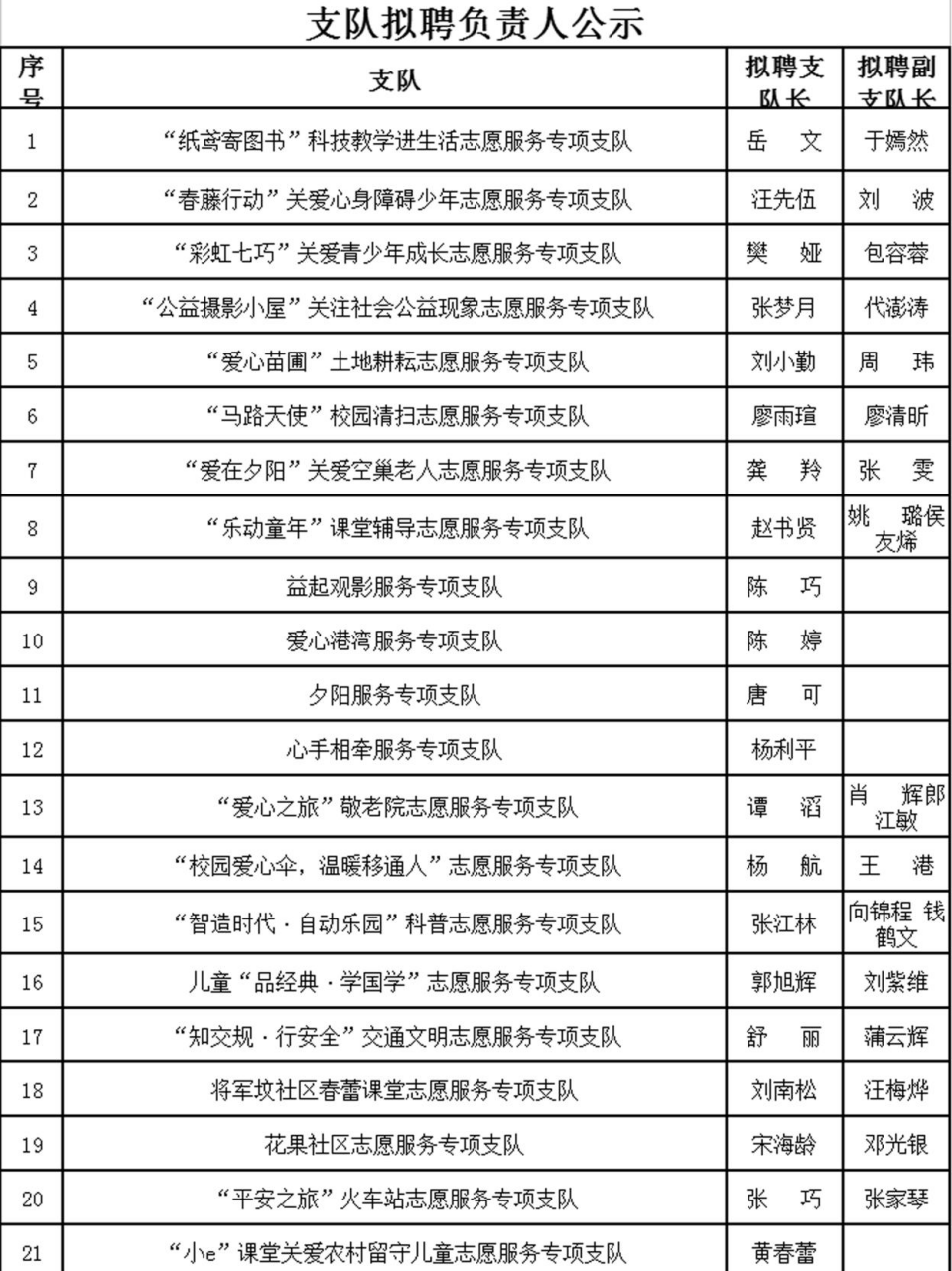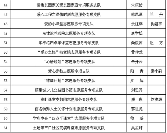 经过轻松的自我介绍后,重庆邮电大学移通学院志愿服务版块岳振远老师宣布了2017—2018学年志愿服务专项支队拟聘负责人名单公示,共有61支志愿服务专项支队正式成立,名单如下: