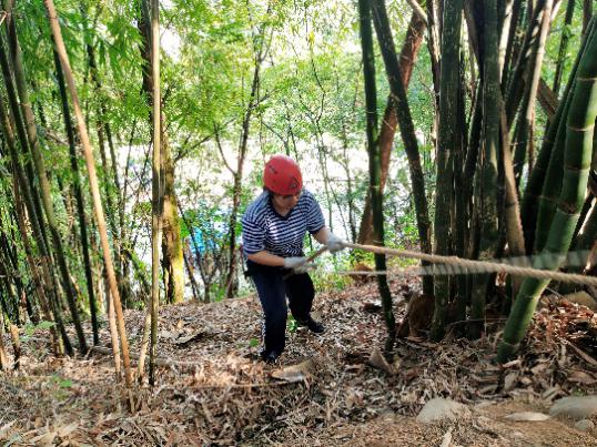 突破和挑战自己的极限穿越。这个项目模拟的是队员依托山体从20米左右高度的地方通过装备下降到地面,从而有效打击敌人。路是非常的曲折,杂草丛生,还会有一块“断崖”,他们不仅要注意地形地貌,还要注意时间,为队友争取更多的时间。学员要挑战自己的心理防线,特别对于恐高的学员来说,这是非常艰难的,可他们都没有放弃,勇于尝试,挑战自己。每个人都在谱写着自己的人生乐章,在这个青春肆意的季节绽放自己。