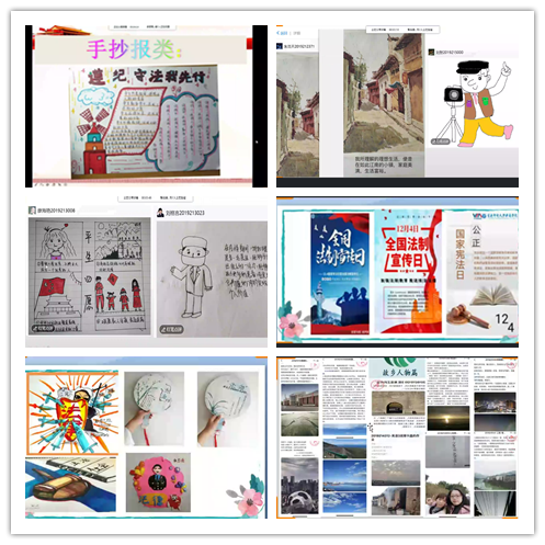 在实践教学成果交流展示环节,首先由《思想道德修养与法律基础》课程组的老师们进行展示。杨欣老师以“如何做一名尊法守法的时代新人”为主题开展实践教学,汇集了诗歌类、书法类、手抄报类、感想类、漫画类、视频类等多种多样作品成果,激发了学生的创新创造能力,增强了学生的法治思维和法治观念;张兴玲老师要求学生以视频、音频、动画、图片、文字创作等方式讲述心目中的“中国英雄”,有学生为坚守在抗疫前线的医护人员创作管弦乐作品《生长》,致敬最美“逆行者”;李佩老师要求学生们化身为法律小主播,讲述法治小故事,用鲜活的案例进行普法宣传;薛杰老师的同学们写下“我和祖国的三行情书”,表达对祖国的眷恋之情,并分别以风景篇、故乡人物篇、众志成城抗疫篇等抒写爱国情怀;陈静老师的同学们参加了多种形式的志愿服务活动,诸如在社区做防疫志愿者,给居民们测量体温和帮助购买生活物资、参加“武汉520”心理抚慰志愿者活动,形成线上志愿者群、参加线上为高考学子加油鼓劲分享高考经验等志愿活动等,同学们从课本走向生活,争做有理想有本领有担当的时代新人。