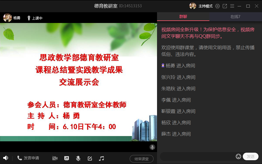 不知不觉中整个会议已持续了八十分钟,大家丝毫没有感到倦意,同学们丰富而精彩的课程实践作业让老师们忘记了时间的流逝。杨勇老师最后总结到:“本学期的实践教学各位老师均能结合当下发生的疫情防控大背景,组织同学们不断挖掘疫情中的生动素材、典型案例,并不断改进教学方法,创新教学内容,把疫情防控的‘战场’转化为大学生的成长‘课堂’,将教材中的理论内容嵌入到丰富实践活动之中,激发了同学们的主动性和创造性,让同学们在潜移默化中接受到心灵的洗礼,很好地提升了教学实效”。