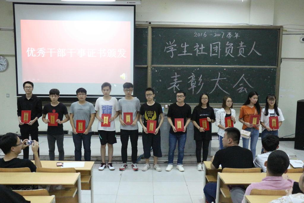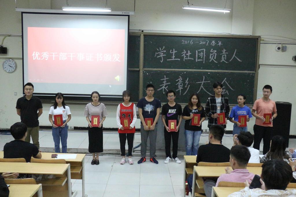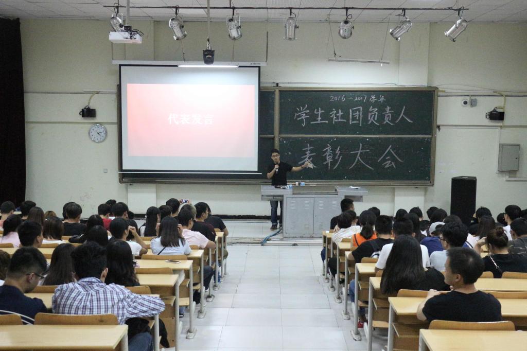 成绩承载过去,信心指引未来。我校2016-2017学年学生社团负责人表彰大会于9月22日下午在3101教室隆重举行。校园社团活动版块负责人蔡星宇老师、学生社团负责老师杨成老师、受表彰的学生社团负责人以及社团联合会全体工作人员出席大会。大会由社团联合会秘书部李白云天主持。