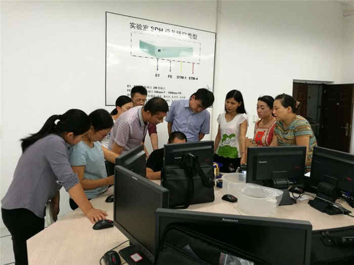 近日,我校大手笔为通信与信息工程系的“光通信网实验平台”购进了一批新的仪器设备。2017年9月21日下午,设备厂商专程派技术人员前来给老师们培训,一时间,S1201的光纤通信实验室人满为患,同事们争先恐后、迫不及待地想一睹它们的风采。通信技术教研室主任易红薇副教授、《光纤通信与SDH》课程负责人周忠伦老师以及课程主讲人和各位对光纤通信感兴趣的同事们纷纷前来,大家积极交流,主动探询各个仪器仪表的功能和使用方法。