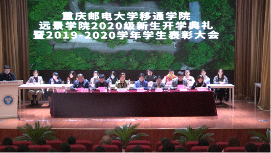10月21日,远景学院2020级新生开学典礼暨2019-2020学年学生表彰大会在下里巴人剧场隆重举行。重庆邮电大学移通学院校长助理孙玺老师、刘枚老师,学生处副处长陈帅老师,书院部副部长穆春江老师,远景学院执行院长皮若兰老师以及远景学院全体教师、高年级学生代表、2020级全体同学和新生家长代表出席了本次大会,会议由远景学院学工副院长李军主持。