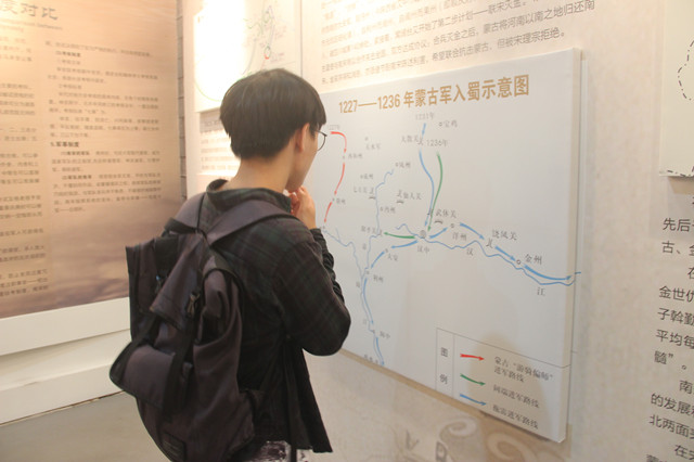 当两个不同文明碰撞总会擦出一片绚丽的火花,又在黑暗中沉寂。在认真聆听博物馆讲解员介绍的同时,许多同学也在谈论着自己的看法。有人说:“南宋若不是因为钓鱼城,也就不会有那么多生命存在于这世上”。也有人谈到:“一个国家需要兵强马壮,民心所望,而不是高官的贪图享乐和政治高层的决策腐败,这样的国家才能国盛民兴,长久立足于世界之林”。种种五彩斑斓看法。谈的人指点江山,听的人津津乐道。对于这一段传奇的历史,每个人都有着自己的独特见解,但都难免感叹钓鱼城之战的历史地位。
