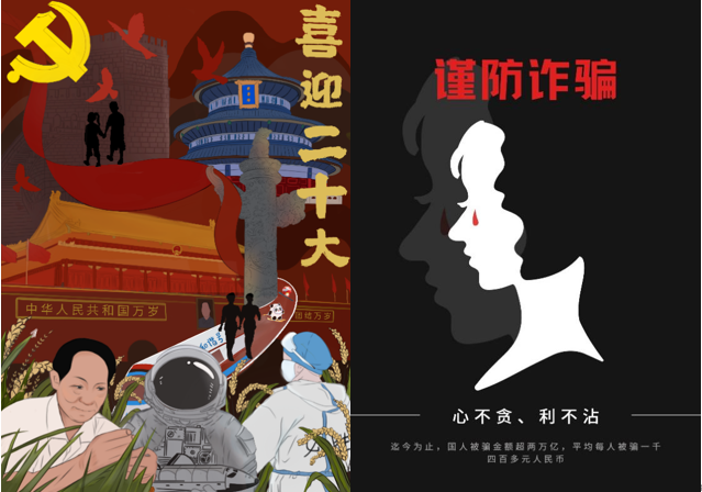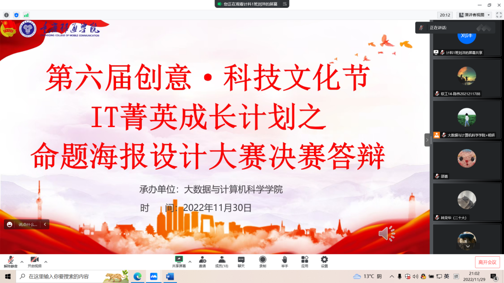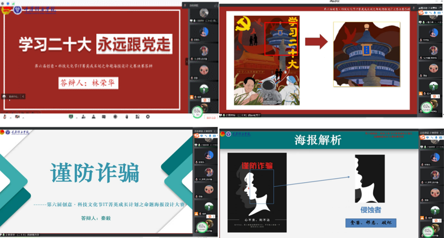 比赛结束后,大数据与计算机科学学院闫会峰老师从主题选择、海报制作、语言表达等角度本次大赛做了点评。党的二十大主题这是很不错的主题,通过制作这类主题海报,领导同学们学习国家发展方向以及各种方针和学习党的二十大精神。预防诈骗是近期学校重中之重的工作,防诈骗类海报非常符合实际,本赛中优秀的海报可以作为后期诈骗宣讲的材料。同学们的心理问题是疫情防控期间学校重点关注的一个内容,闫会峰老师还建议可以通过本次活动中的心理类海报进行全校宣传,从而帮助同学们缓解心理压力。
