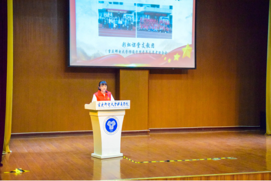 “一根线容易断,万根线能拉船”,团队的力量从来不容小觑。彩虹课堂支教团、品牌支队代表唐文敏同学伴着幻灯片中一幕幕感人情景,讲述来自于志愿团队的暖心故事,分享他们的志愿服务足迹。在融入团队的同时,获得更深刻的历练,收获友谊、懂得团结、学会坚持…担负起更重的集体责任与义务,升华自我的价值。