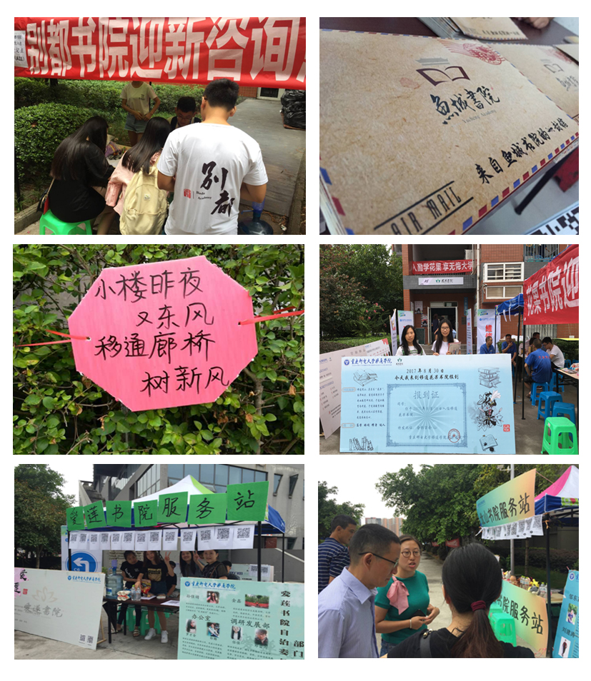 花果书院在新学期开始便精心制作了“致新生的一封信”贴在了每个宿舍的门后,并走访宿舍关切学生新入住的感受。同时,花果书院也精心筹备着中秋的活动,为每栋宿舍楼入口处绘制了喜迎中秋国庆的板报以及制作了“权益反馈信箱”。廊桥书院进行了第一次师生见面会。赖昌容老师向同学们寄予厚望并表示肯定,大家其乐融通,第一次感受到了在廊桥的存在感。鱼城书院除了在开学后进行了走访宿舍活动外,还进行了一次说走就走的钓鱼城博物馆参观。此行鱼城书院学生自治委员会和钓鱼城研究会携手为80余名同学回顾当年不败神话,寻找历史的真相。北山书院也独具匠心的为中秋活动做了准备。从材料的选择,加工到底台的搭架,大家都是相互帮助,一起共同讨论,共同完成的,“单丝不成线,独木不成林”,大家用行动诠释了这句话。别都书院顺利完成“天台破冰之旅”。一段段印象深刻的自我介绍,一个个趣味横生的小游戏,同学们在天台欢声笑语,心连心。汇江书院也为新兴血液们开展了一次见面会。会议以“破茧成蝶,凤凰涅槃”为会议主题。首先播放了汇江书院的宣传视频,该视频让干事们进一步了解汇江书院、表达对新干事的热烈欢迎。爱莲书院秋意浓,情谊深,书院在以后会相继开展各式各样的活动,让同学们享受里面的人文情怀,融入这个欢乐场。一院灯火闹佳夕,有你才是真团圆。爱莲书院,在这里陪伴你。