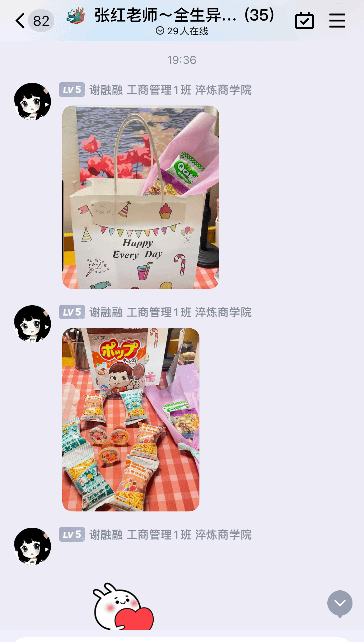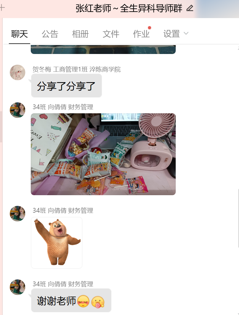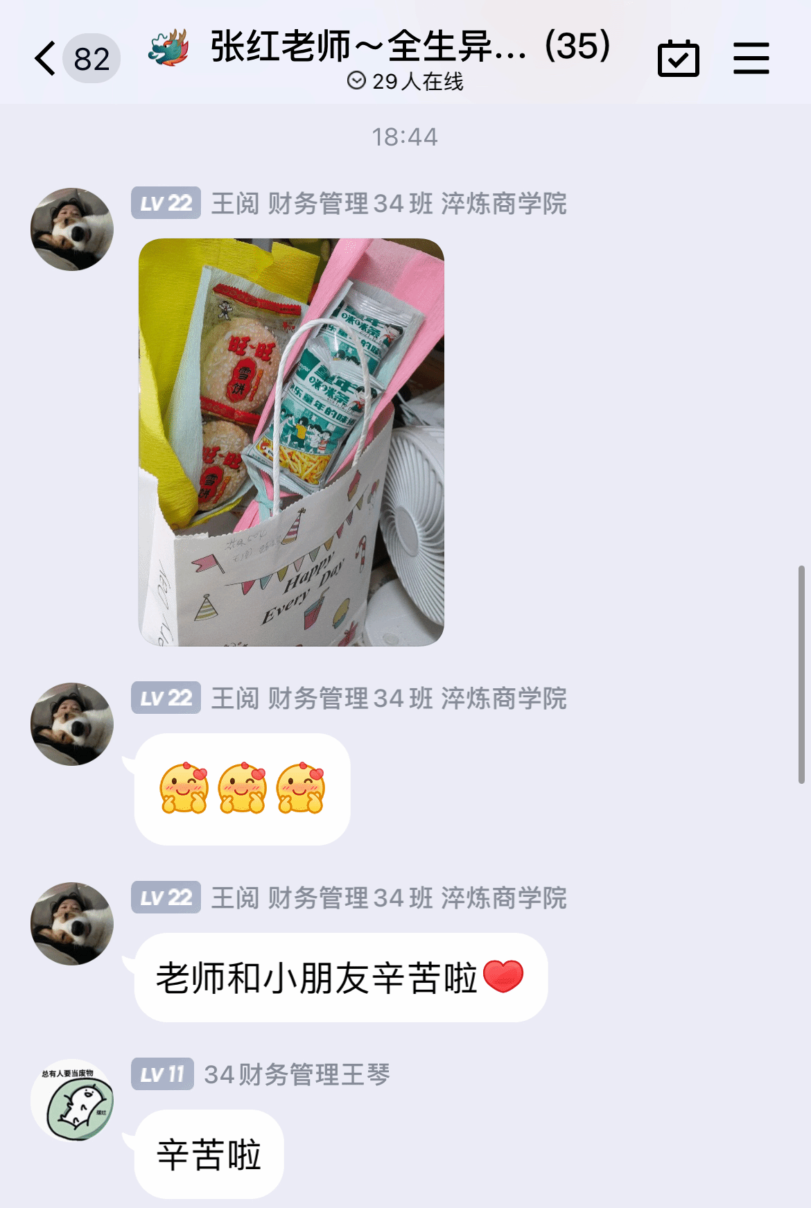 活动前一天,张红老师通过在本组异科导师QQ群中,发布活动通知,得到了同学们的积极响应,根据统计好的相应寝室号及人数,老师秘密地准备了小礼物,并为同学们及室友精心包装了零食小花束。