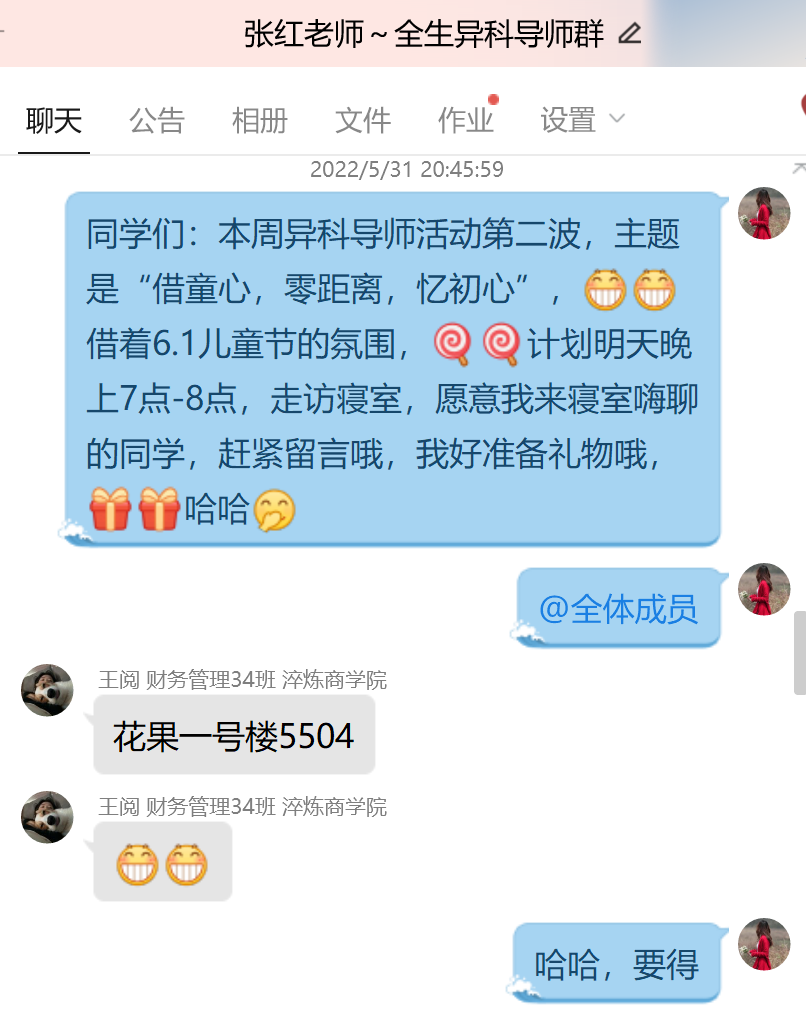 本次活动依托6.1的节日气氛,走进寝室,深入了解本组女生们的在校生活情况,通过深入聊天,更懂得同学们的指导需求,希望在异科的道路上,能帮助同学们更好的成长。