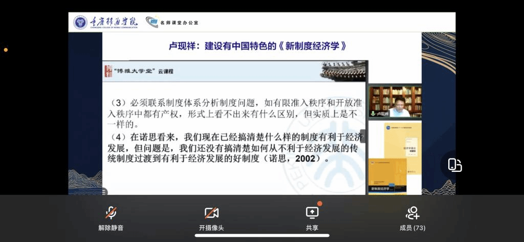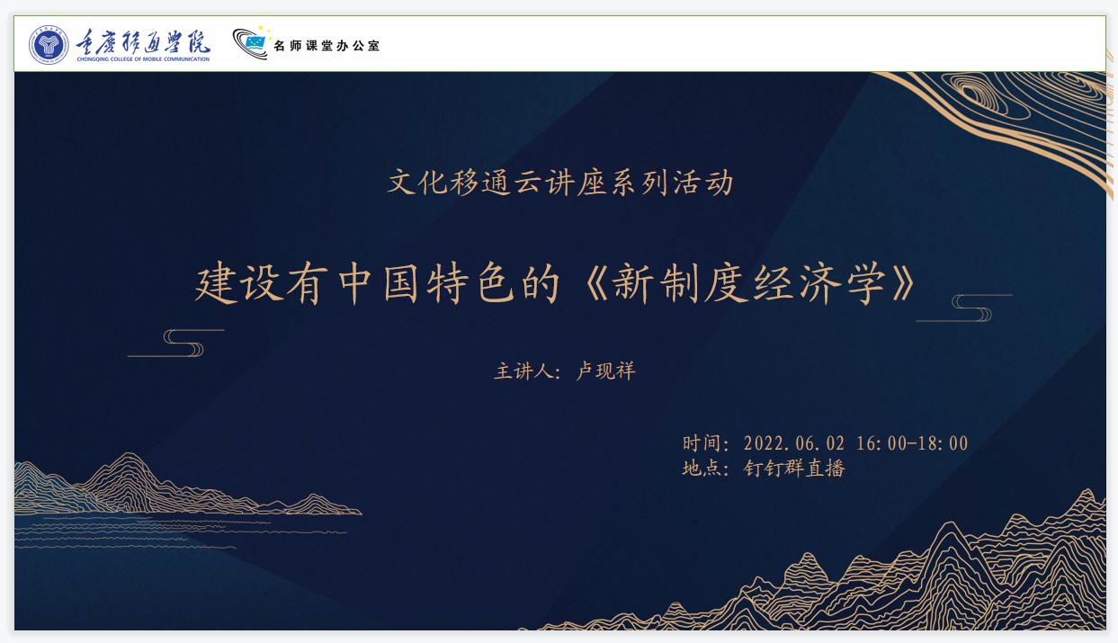 所谓新制度经济学,正如科斯所说,即是用主流经济学的方法分析制度的经济学。新制度经济学的发展初具规模,已形成交易费用经济学、产权经济学、新经济史学等几个支流。6月2日下午4点,文化移通线上研讨课带来了卢现祥教授的《新制度经济学》一课,带领同学们一起掌握了新制度经济学的基本理念。