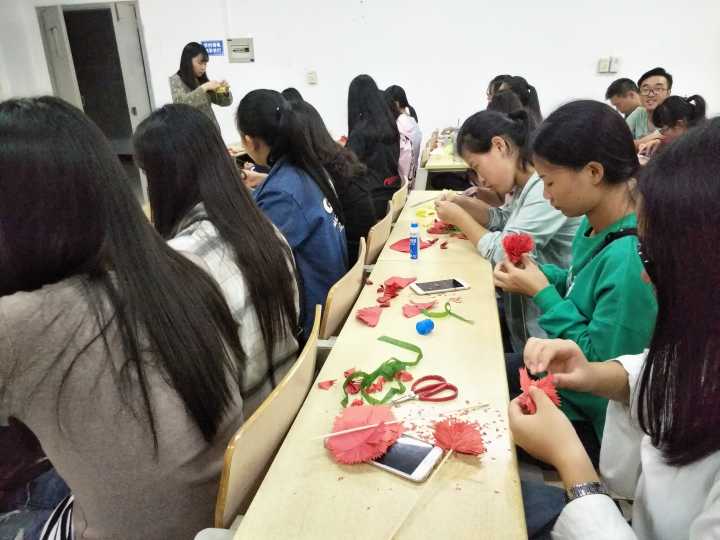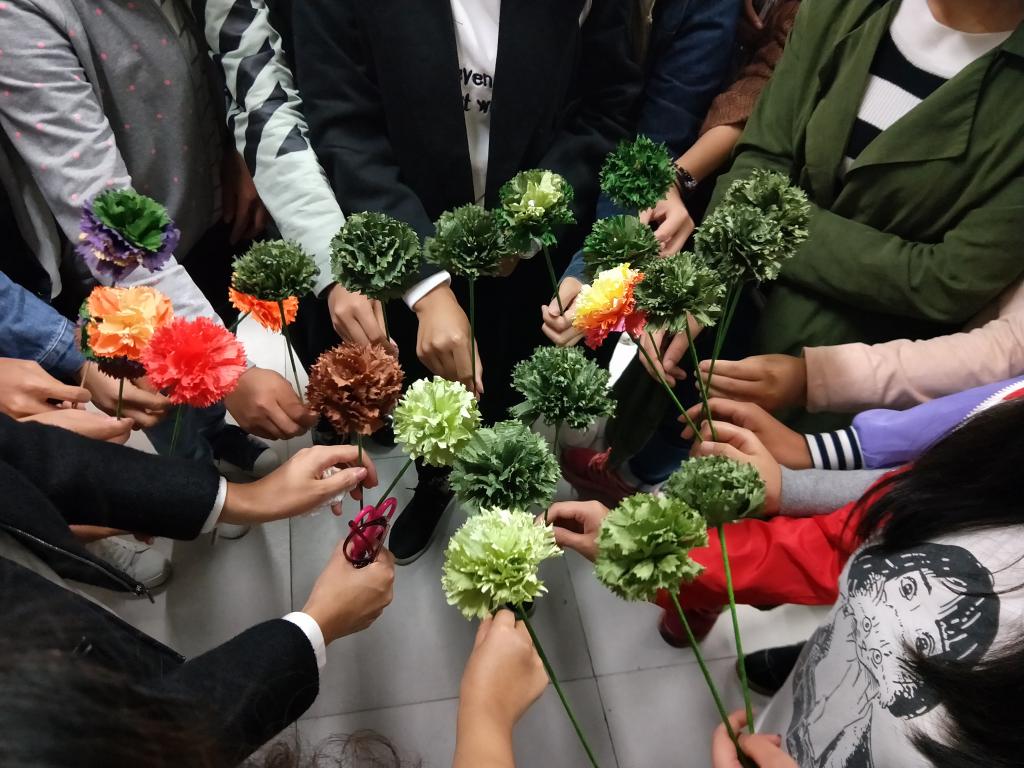 十月微凉,树叶也逐渐枯萎,温度的下降让路人们都纷纷添加衣裳。手工协会的社员们带着如火的热情齐聚在一起,进行康乃馨的制作教学。八张同色纸制花瓣,在同学们手上来回的弯曲和折叠。修剪锯齿时同学们的动作是那么地仔细认真,对每片花瓣的搓揉又是那么地小心翼翼,他们希望每一片花瓣都能真挚的流露出自己对母亲的爱。