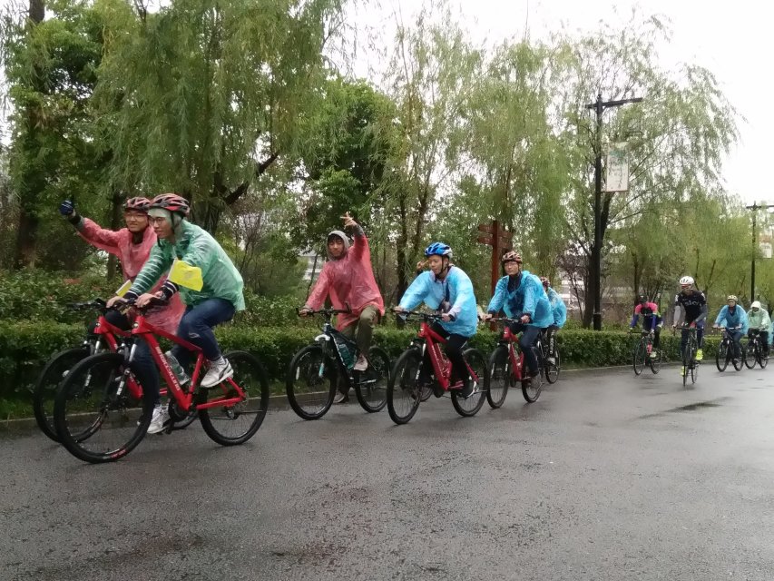 上午八点半,参与者们全部到达校门口集合签到,大家三五成群,热烈地讨论着关于骑行的事宜,共同期待着这次骑行带来的美好的体验。深秋时节,细雨绵绵,淅沥沥的小雨冰凉凉的,却难以浇灭同学们对本次骑行活动的热情。