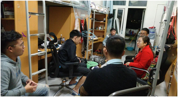 2017年10月17日晚21点,北山书院综合办公室主任冯元老师和北山书院发展导师向汀带着调研部部长王熙樟同学对北山书院学生宿舍区进行了走访。此次活动的目的在于让同学们更好的了解与认识书院,搜集同学们对书院内部功能区改造的期待和建议,让同学们积极参与到书院建设中来,让家文化真正植入大家心里。想同学之所想,急同学之所需。
