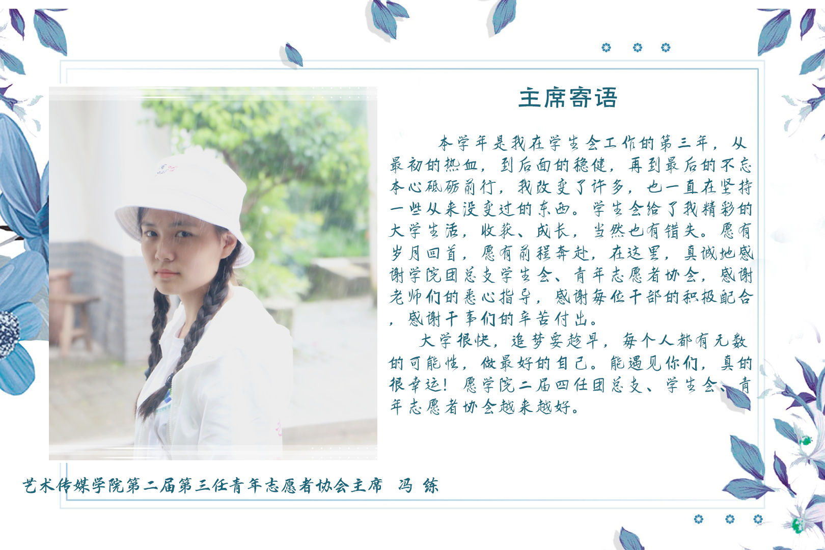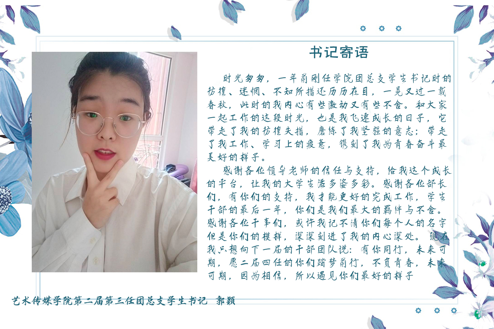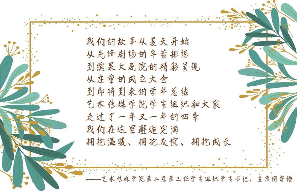 艺术传媒学院学生组织是在校团委指导下开展工作的学生组织,在维护学生权益、服务学生成长、引导学生成才、开展完满教育活动工作中发挥着积极作用。本着“全心全意为学生服务”的宗旨,在校团委的指导下,遵循公开、平等、竞争、择优的原则,学院每年将为学生组织领导班子选拔配备一批优秀学生干部。过去的一年中,艺术传媒学院第二届第三任学生组织成员们坚持初心,不断奋进,为学院、学校完满教育工作的开展作出了应有的贡献。时光流逝,又是一年换届时,为了下一届学生组织的更好发展和成长,艺术传媒学院第二届第三任学生组织学生书记、主席团纷纷送上祝福,以工作经验的分享和个人寄语为他们进行祝福!愿艺术传媒学院第二届第四任学生组织在接下来一年的工作中不忘初心,逐梦前行!愿艺术传媒学院团总支学生会发展越来越好!