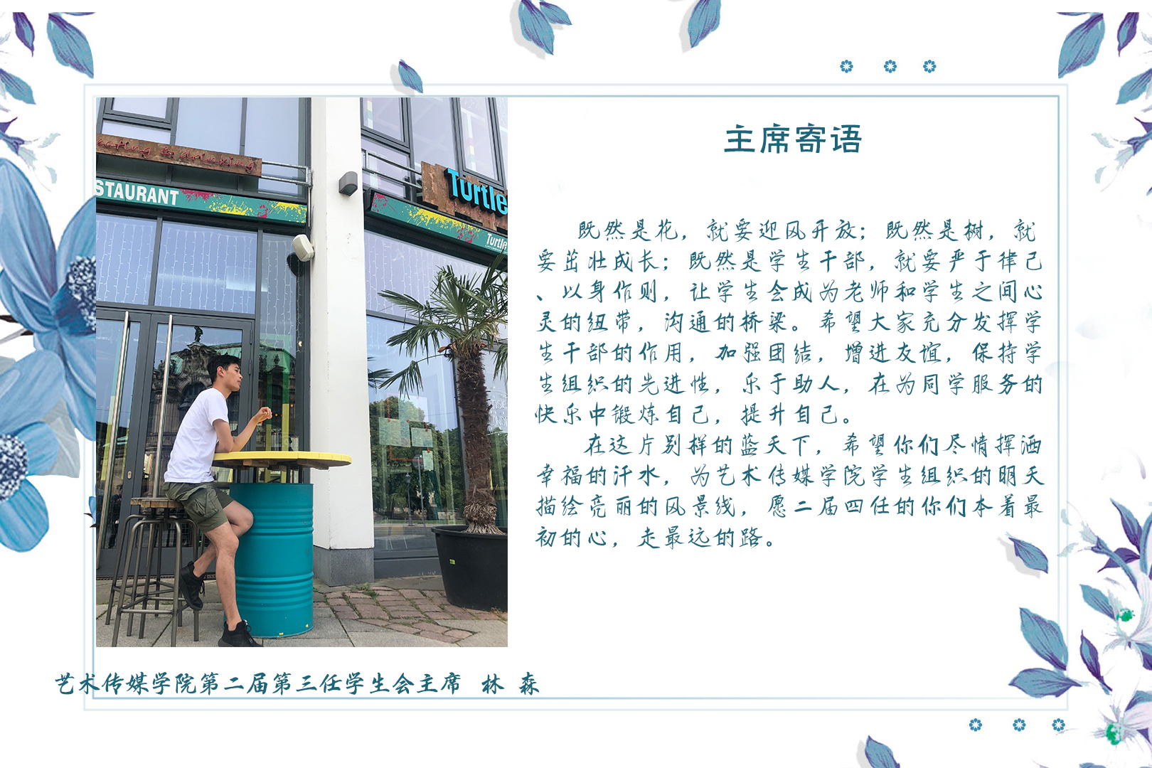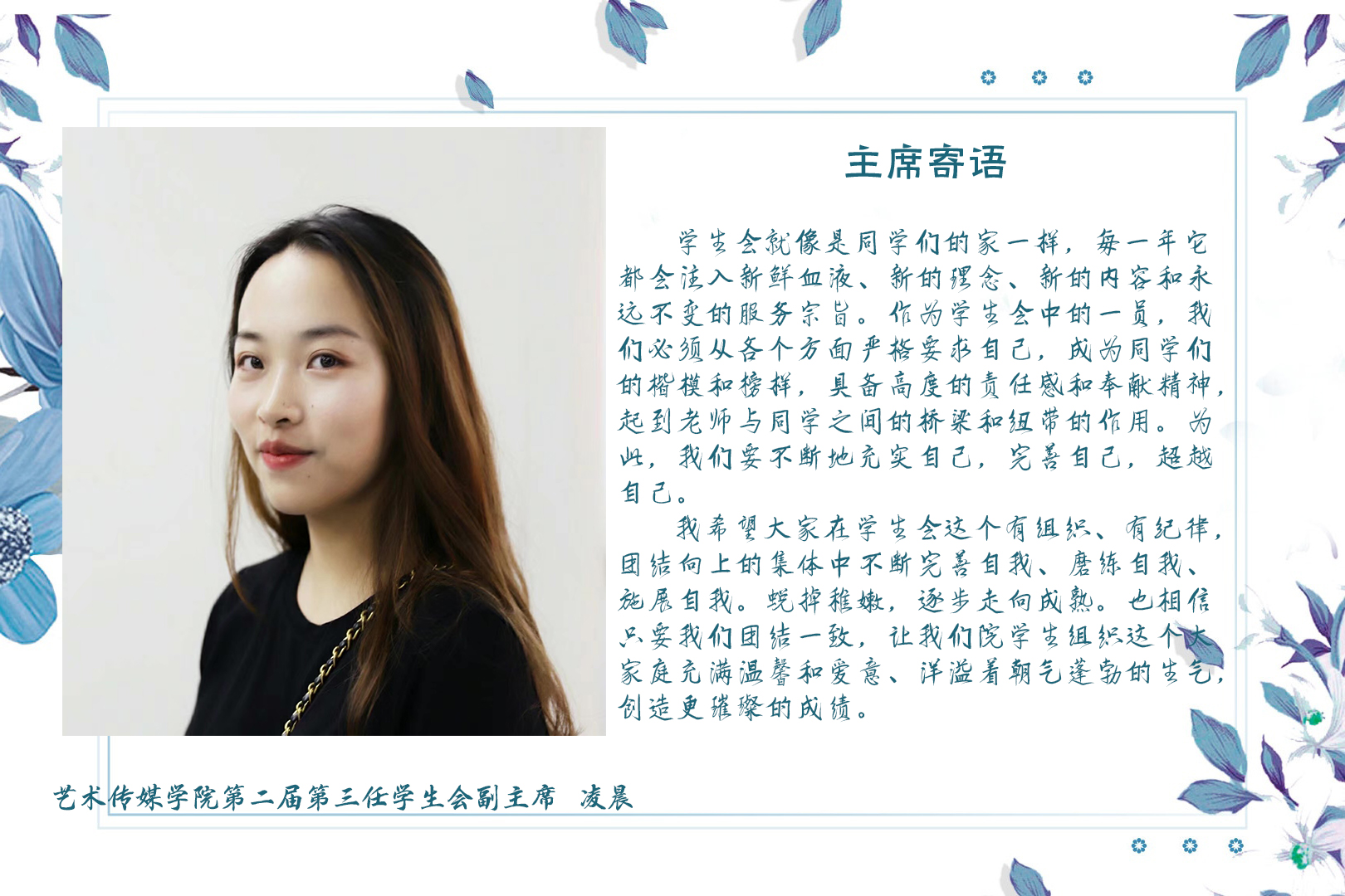 曾任艺术传媒学院第二届第三任学生会主席一职的林森同学对于三年来老师的帮助与照顾表示:“学生工作三年,完满相随。首先请允许我代表艺术传媒学院第二届第三任学生书记处、主席团成员向各位老师说一声谢谢,感谢你们在过去的一年中对大家的关心、指导和帮助,”同时她对学生组织全体成员表达了感谢,也对即将开始的学生组织新故事送出了祝福:“也非常感谢艺术传媒学院第二届第三任学生组织全体成员作出的努力和贡献。同时对第二届第四任的各位同学表示感谢,感谢你们继续留在这个充满活力的大家庭,继续发光发热!”