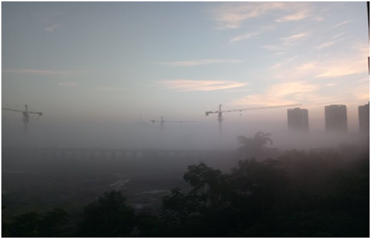 浮动着的轻纱笼罩着北山,山上的建筑和树木若有若无。迷雾减淡的地方,又隐隐露出建筑和树木部分的轮廓,随着迷雾的浓淡,变幻多姿,仿佛天外飞仙、海市蜃楼。