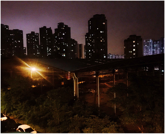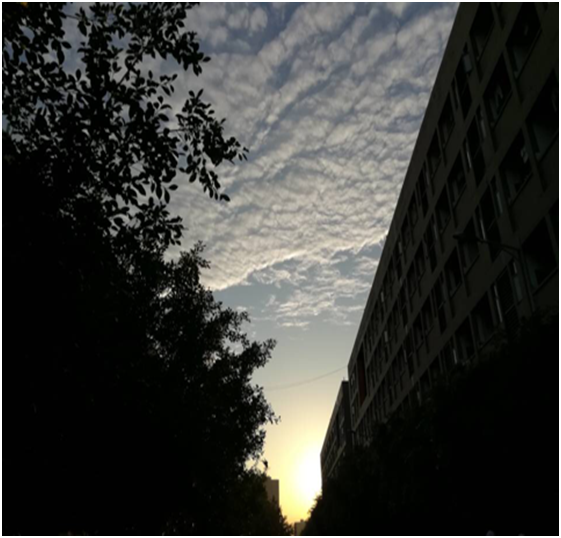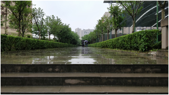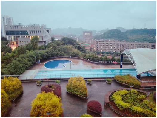 俯瞰山下景色,远处绵延的山峰,黄昏时分绚烂多姿的彩霞,蓝天下清澈见底的泳池,都为朦胧的天空增添了一抹亮色。近看宿舍楼前伫立着一排排枝繁叶茂的高大绿墙,树冠与树冠抄着手形成一排天然的绿伞,风一吹树叶沙啦啦作响,伞下三五成群的人或聊天或打闹或对弈伴着孩童天真的嬉戏。