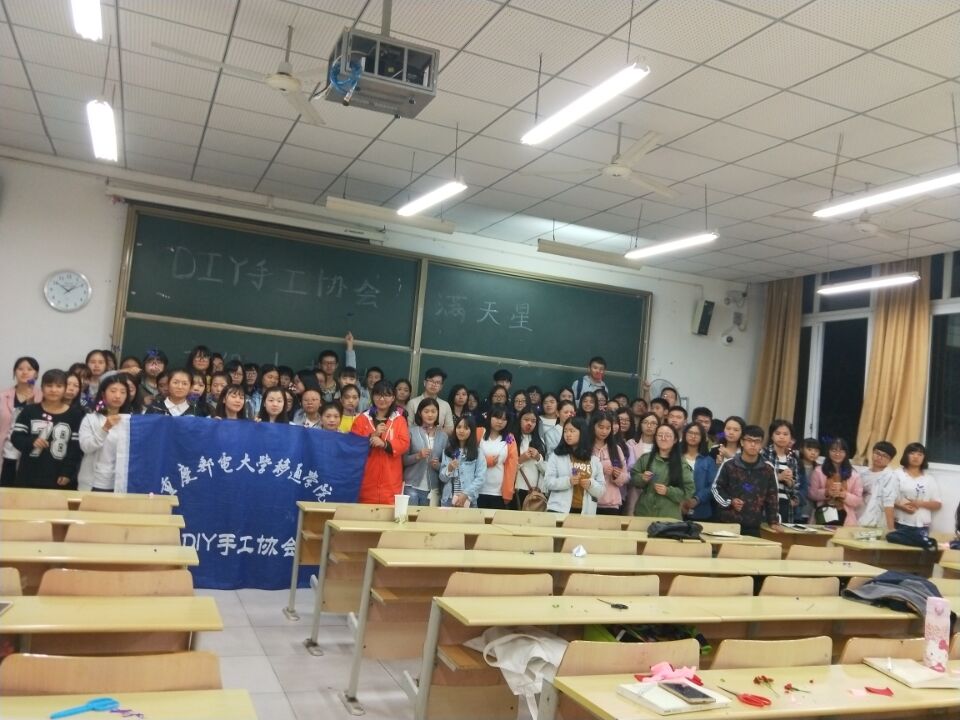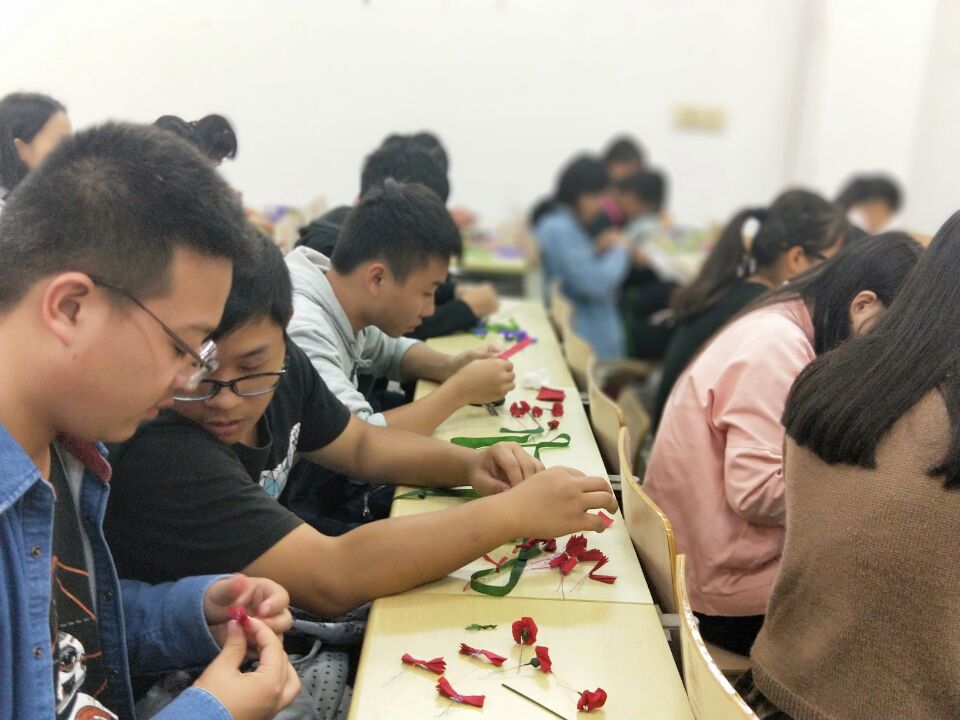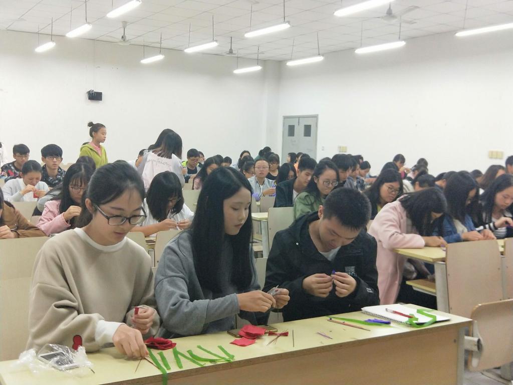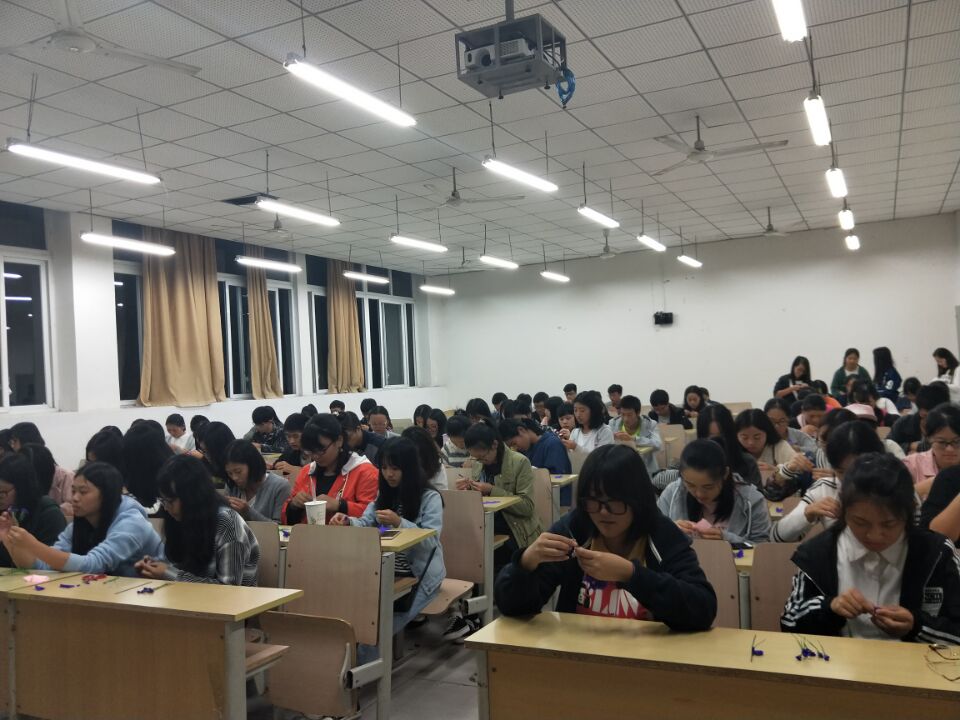 虽然活动时间在晚上,但同学们依旧对我们所教学的内容保持着憧憬与热情。活动时间临近,所有人已经到达教室等待教学——教学开始了,大家开始动手跟着学习,每个人手里的八张纸片经过翻转,变成了我们小时候经常玩的小扇子,这时候我们的铁丝派上用场了,一根根铁丝宛如少女的轻柔发丝,极易扭动弯曲,最终每根铁丝都和纸片完美结合,加上绿色胶带,我们的满天星就制作好了。