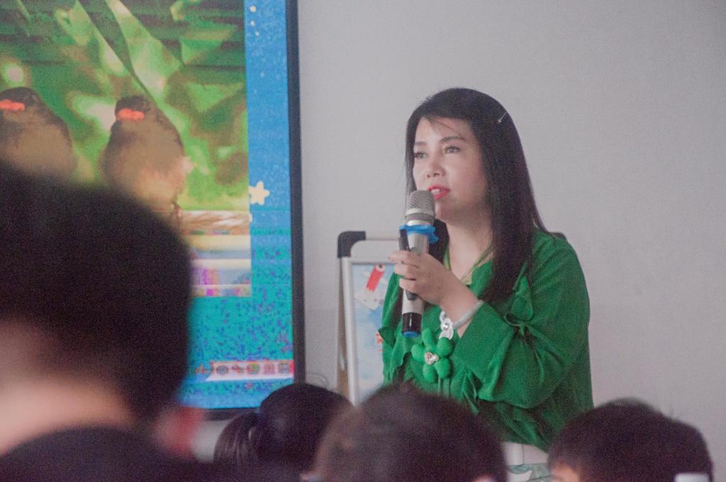 当主持人介绍毕然老师的时候,大家惊讶作家旺盛的创作力,身穿绿色衣裙、头发黑亮的毕然老师居然已经写了53部作品,还获得了很多奖项。而毕然老师则笑着说,“我愿意自己是童话《小王子》里B612-5星球的点灯人,每天的工作是每天早上点亮路灯,唤醒一颗星星或花朵。晚上熄灯,送星星或花朵进入梦乡。连童话中的小王子都喜欢点灯人的星球,并夸奖着说:点灯人是一份美丽的职业。”这种别具一格的自我介绍,瞬间拉近了与小读者间的距离。毕然老师说自己多年来一直坚持文学启蒙的公益讲座和读书活动,以培养扶持文学新苗作为“点灯人”——教师的责任,大家不由自主地为她鼓起掌。