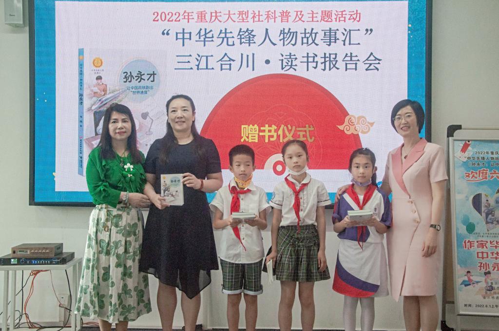 在赠书仪式上,重庆合川区政协副主席李文莉女士、合川区图书馆馆长刘格女士和国家一级作家毕然教授,为来自合川区久长街小学、新华小学、高阳小学的学生代表们赠送了图书《孙永才:让中国高铁跑出“世界速度”》,让现场的孩子们感受到浓浓的关爱情和书香意。