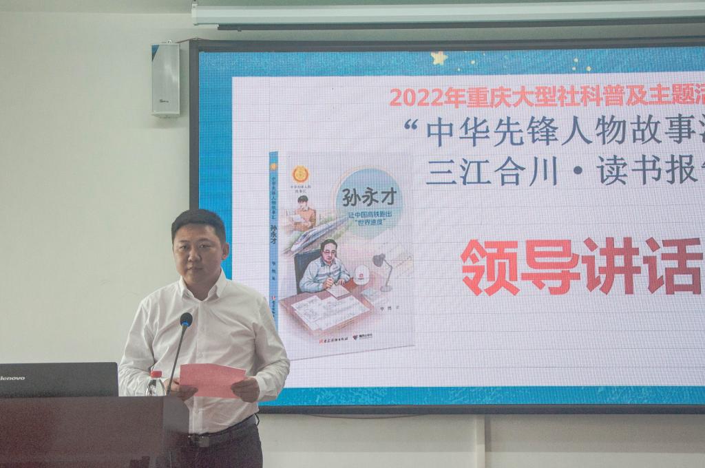 上午10点左右,由重庆社科联、民革重庆合川区工委、合川区社科联、合川区图书馆、重庆移通学院创意写作学院、重庆移通学院廊桥书院魁星工坊社科基地联合组织举办的2022重庆大型社科普及主题活动“中华先锋人物故事汇”·三江合川读书报告会即将拉开序幕,来自合川区久长街小学、新华小学、高阳小学的同学们,在八楼培训室翘首期盼,等待着著名儿童文学作家毕然教授为大家分享《孙永才:让中国高铁跑出“世界速度”》。
