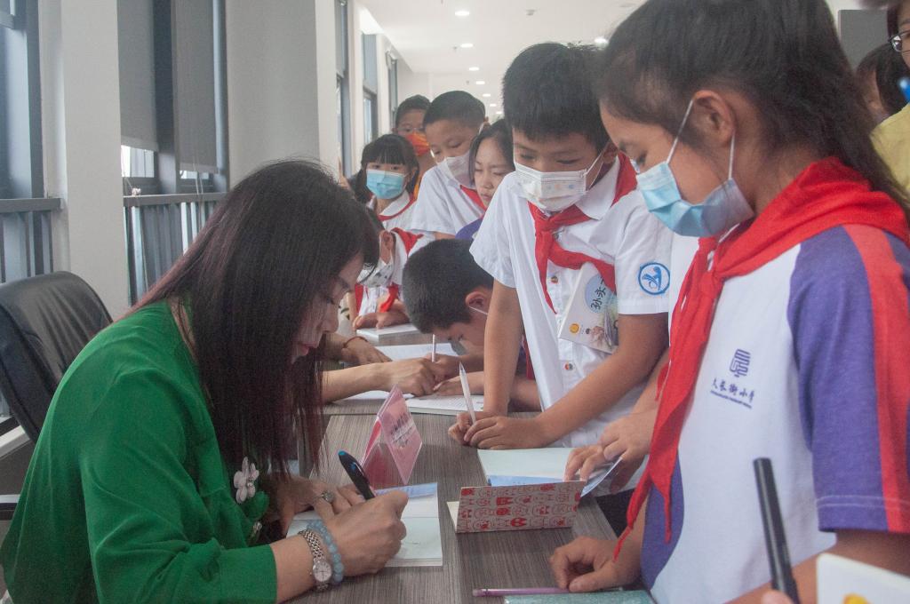 读书报告会结束后,许多孩子要求要和作家毕然老师合影留念,在签名台前排满了等着签名的孩子们。毕然老师非常耐心地为孩子们一一写上了他们的名字,还写上鼓励的话语。来自久长街小学的学生向函可说:“今天是我过的最开心的六一儿童节,不仅听了一场读书报告会,学习了知识,还得到了作家亲笔签名的图书。”