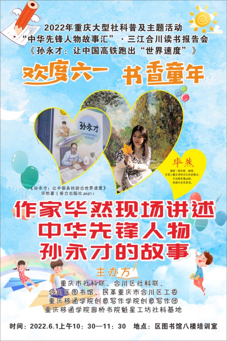 六月一日是世界国际儿童节。在这个充满童趣的美好日子大家都会有不同的感受,因为每个人都曾经是个小孩子,都是由儿童成长为大人的,所以童年是我们最美好、难忘的记忆。今年六一国际儿童节,在合川区图书馆开展了一场别开生面的活动:2022年重庆大型社科普及主题活动“中华先锋人物故事汇”·三江合川读书报告会,由著名儿童文学作家毕然老师讲述中华先锋人物、高铁专家孙永才的成长故事。