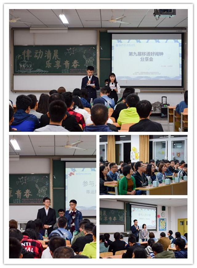 虽然移通好闹钟活动只有短短五天,但是其中发生的故事却不胜枚举。2017年10月19日19:00美宣部在5102教室举办第九届移通好闹钟分享会,为好闹钟的参与者们提供了一个分享故事的机会。而本次分享会也邀请到了团委杨成老师、王斯羽老师,计算机科学系学工办主任谢银平老师,2014级辅导员童学容老师,2015级辅导员兼社团活动板块指导老师任瑞娟老师,2017级辅导员马喆老师,阙小梅老师,王焱老师等与同学们一起倾听交流活动的点点滴滴。