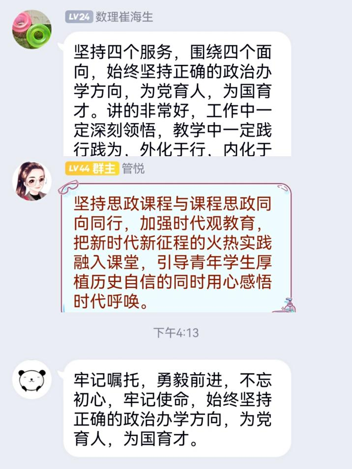 在观看学习结束后,我支部同志们积极反馈学习成果,共收到多条反馈信息,多张学习视频。崔海生同志反馈“在以后的工作中一定深刻领悟,教学中一定践行践为,外化于行,内化于心”;管悦同志认为“把新时代新征程的火热实践融入课堂,引导青年学生厚植历史自信的同时用心感悟时代呼唤”。