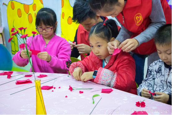 手工制作,在某种意义上说,就是一个欣赏美、鉴别美、创造美的过程。在此过程中,小朋友们收获纸质花朵的制作方法和自己动手带给他们的满足和欢乐。志愿者们则收获一张张笑脸和满满的感动。这就是志愿情——我们在爱中,砥砺前行;我们在志愿服务之旅中,永不停歇!
