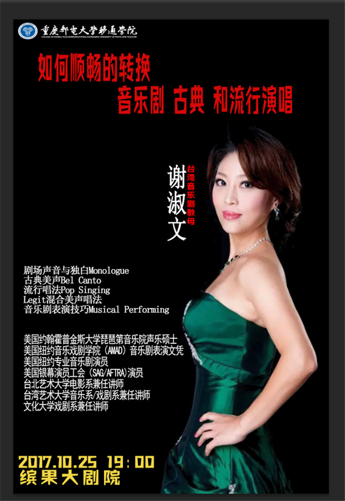 通过选手们不一样的唱腔让我们明白唱腔的博大精深,并且从谢淑文老师现场的指导中我们也看出谢淑文老师的风采!通过本次谢淑文老师的如何顺畅的转换古典、音乐剧、和流行演唱讲座,带给学校以及我校学生学习音乐剧的机会,更让同学们感受到了音乐剧的艺术魅力。不要浪费時间在你沒有的地方,而是在你本身就有的天分上,好好去磨亮,让它发光,成就属于我们自己的完满!
